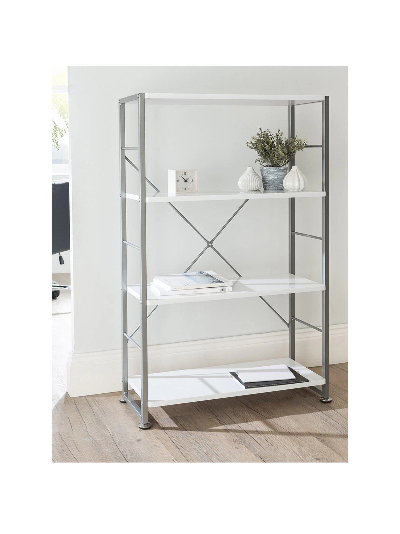 A truly modern way to show off your collection of books, ornaments and more, itĀ features 4 white shelves which are supported byĀ a grey frame. Adjustable feet allow for easy alignment on uneven floors, while a wall attachment keeps it secure forĀ safety.Ā
