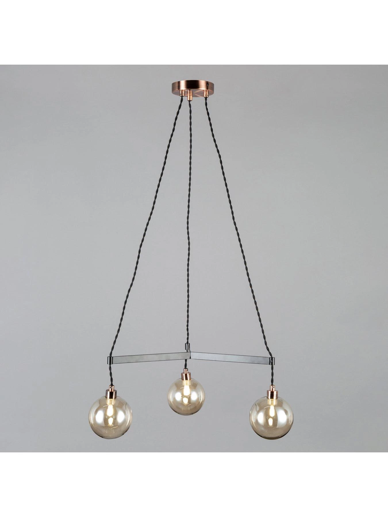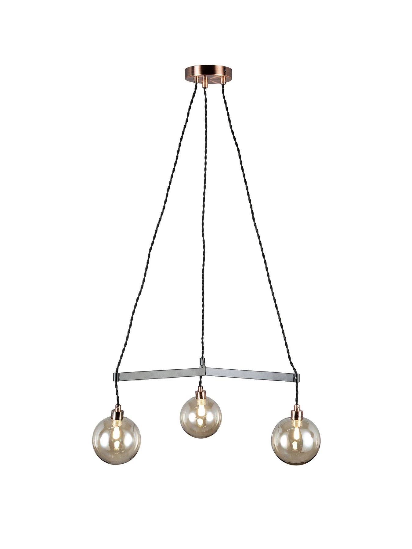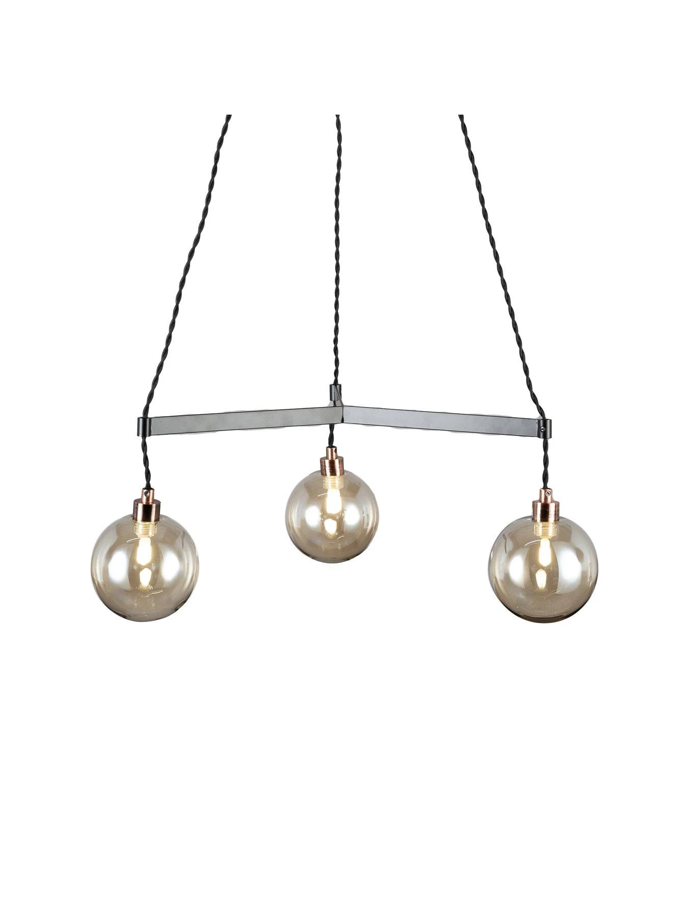 The copper coloured fitting supports three black arms that are each finished with a smoked glass shade which softens the light as it passes through. The height adjustable fitting can have a maximum drop of 100 cm and a minimum drop of 23 cm.Â