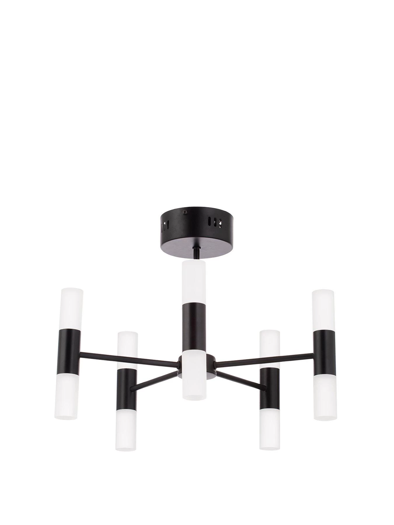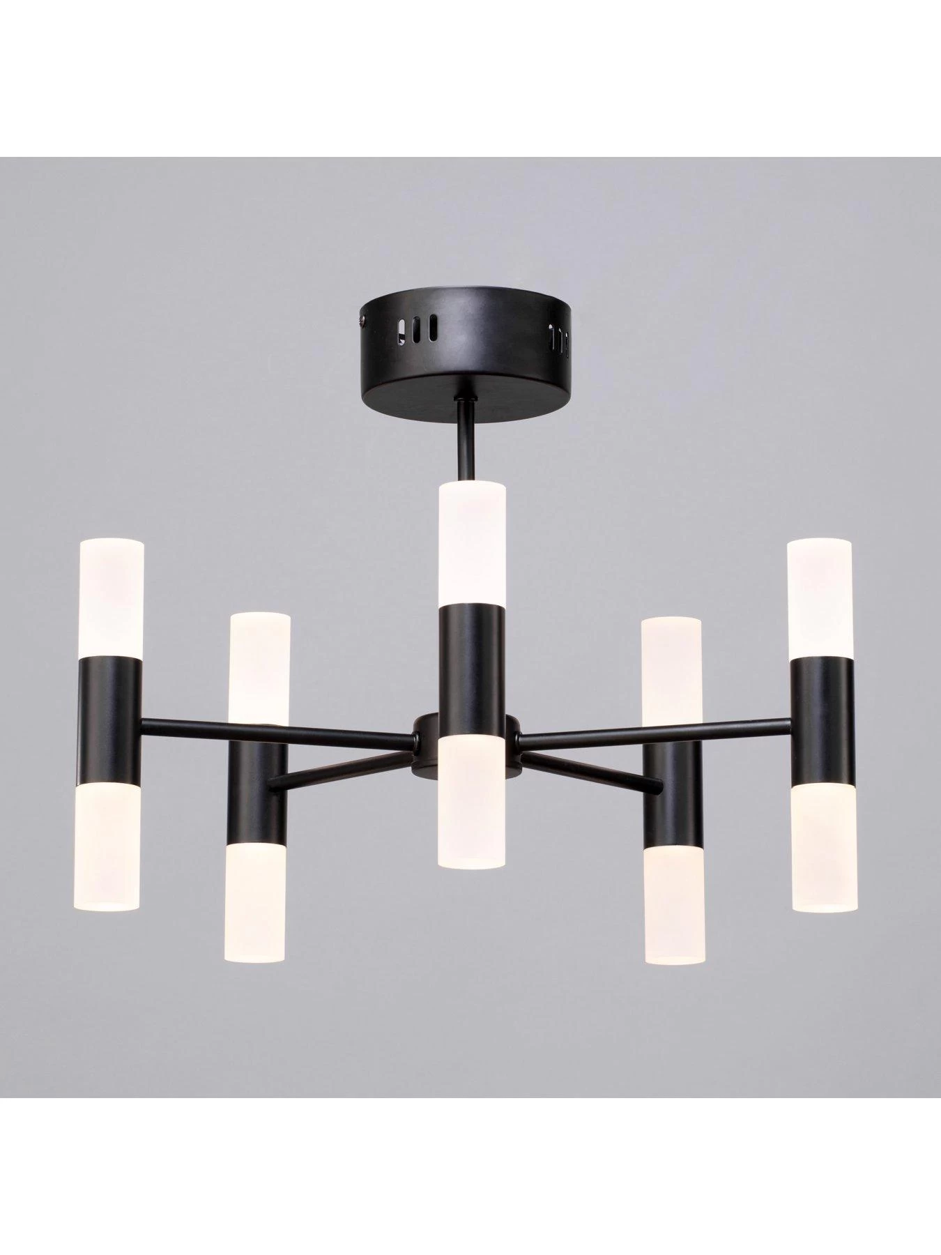 The bold black metal fitting supports five arms, each of which is finished with two frosted glass shades – these diffuse the LED light to create a softer illumination in your space.