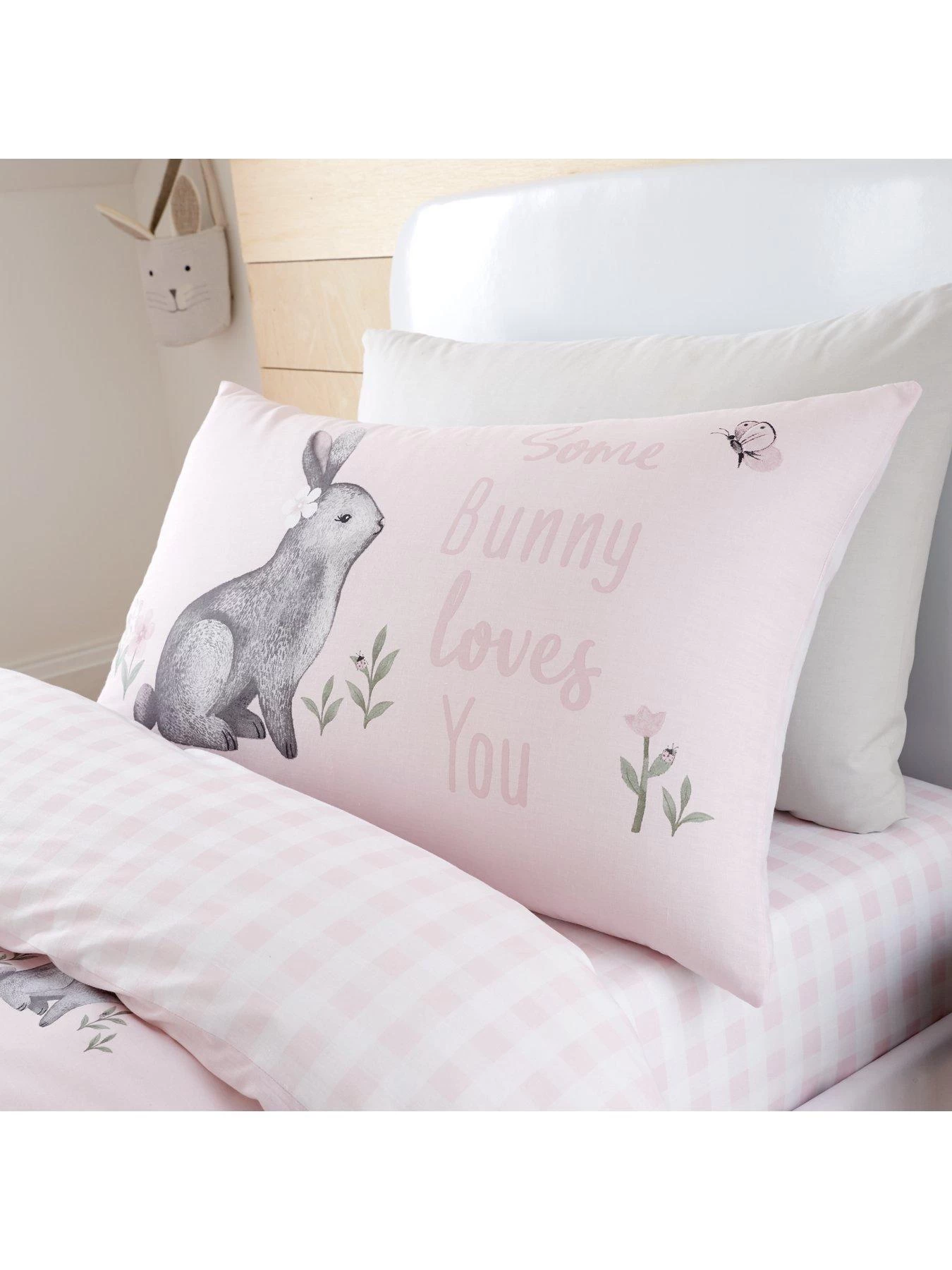 Pretty in pink, this single duvet cover set is the centrepiece of the range, featuring stylised cartoon bunnies, hedgehogs, squirrels and owls set against a soft pink canvas. The pillowcase coordinates with another rabbit and reads some bunny loves you. It’s finished with a gorgeous gingham reverse for an added hint of traditional beauty.