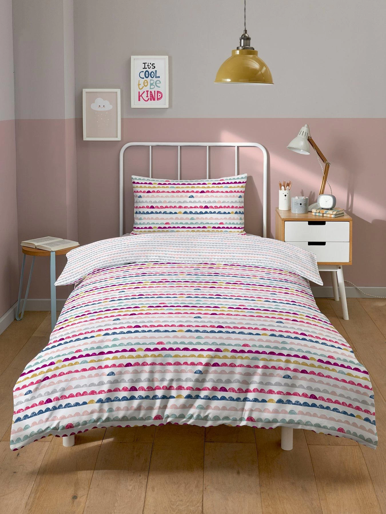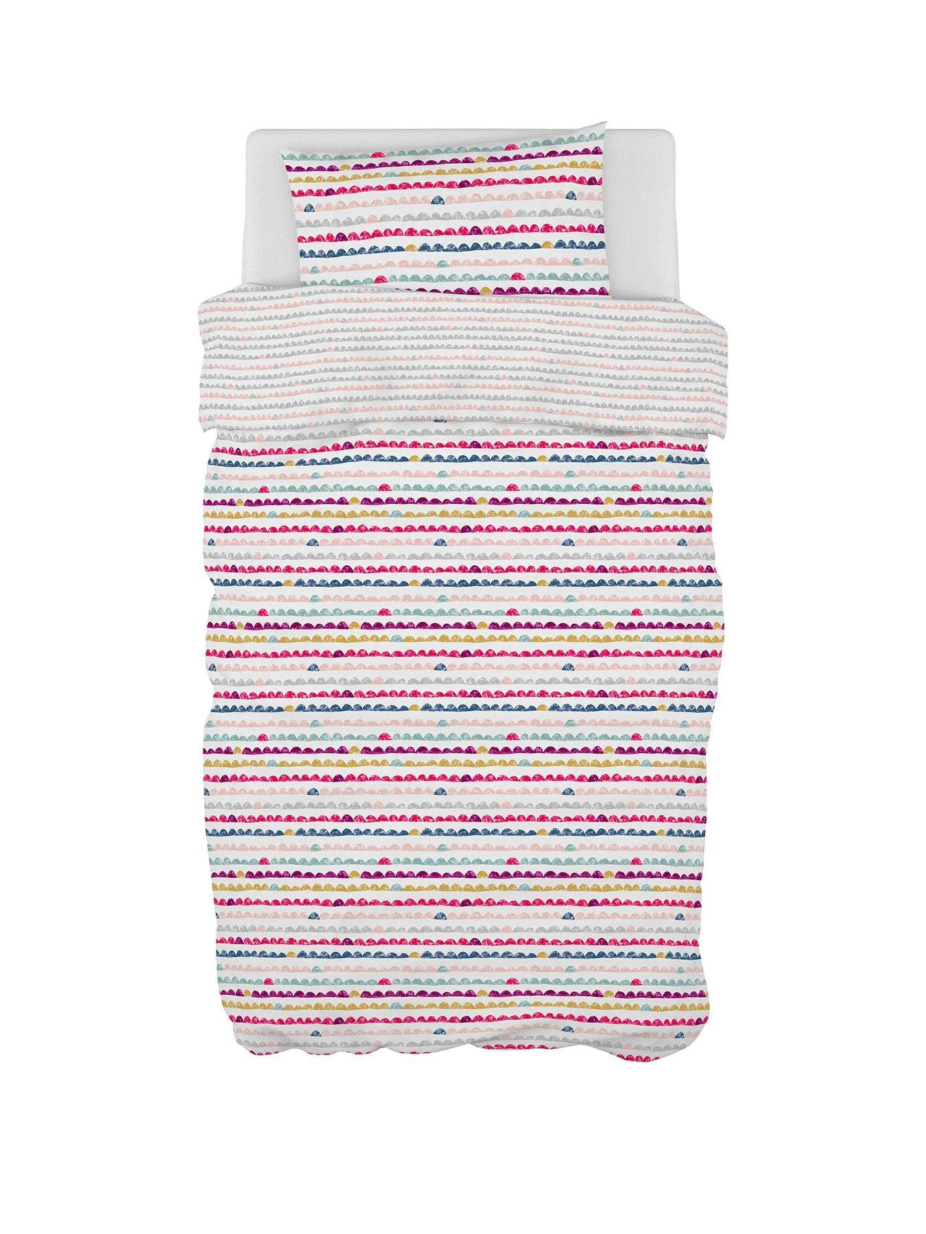 TheĀ crisp white polycotton fabric is decked in a Scandi-inspired print of colourful abstract waves. Featuring splashesĀ ofĀ blush, hot pink, berry, mustard, aqua, blue and silver, the reverse has a muted version of the same design, so they can flip it over whenever they feel like switching things up a bit.