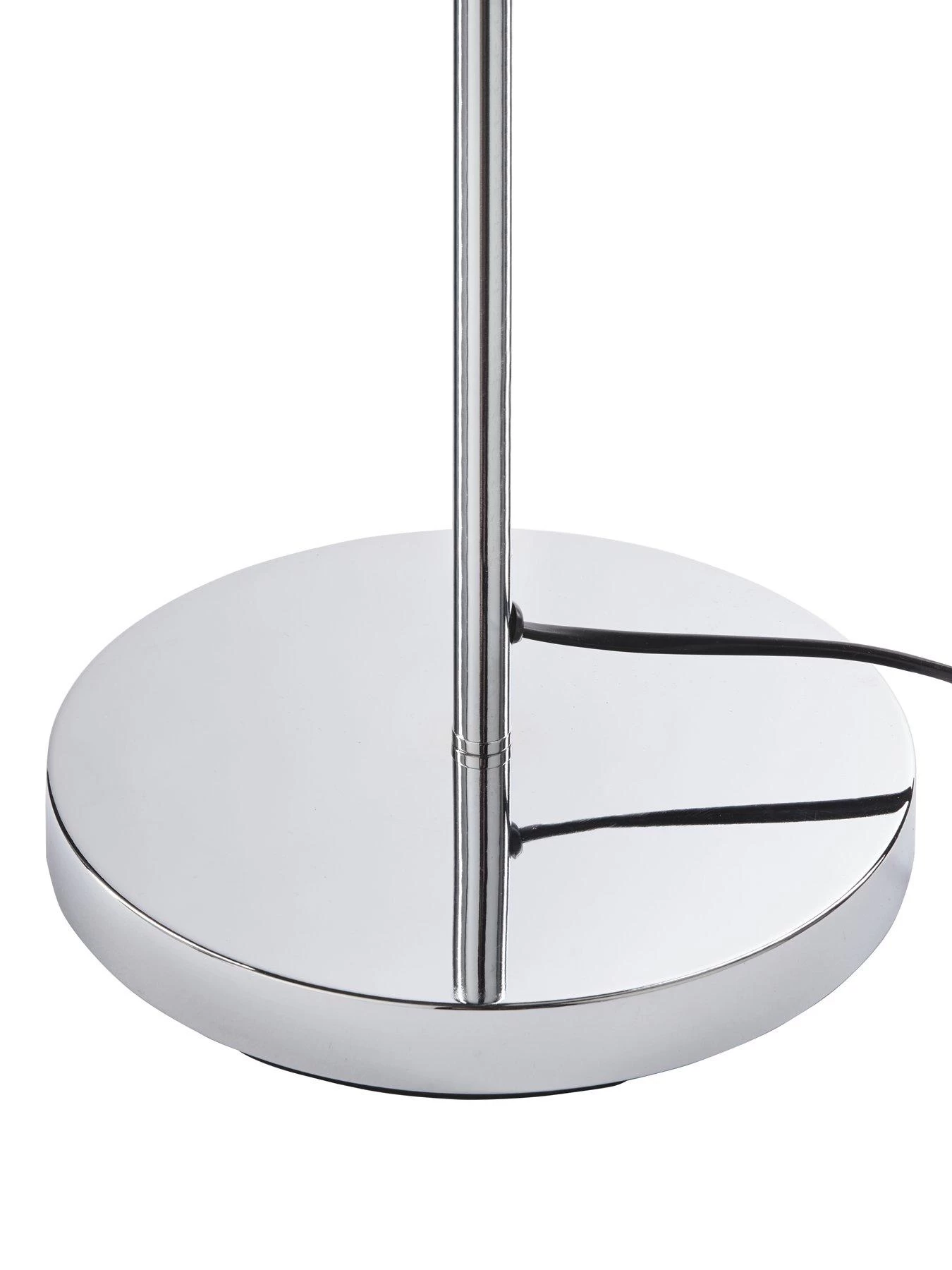 A textile fabric shade is finished in a modern grey hue that will match most decors, while a chrome plated base and stem shine in the glow of the light to draw even more attention to the contemporary design.