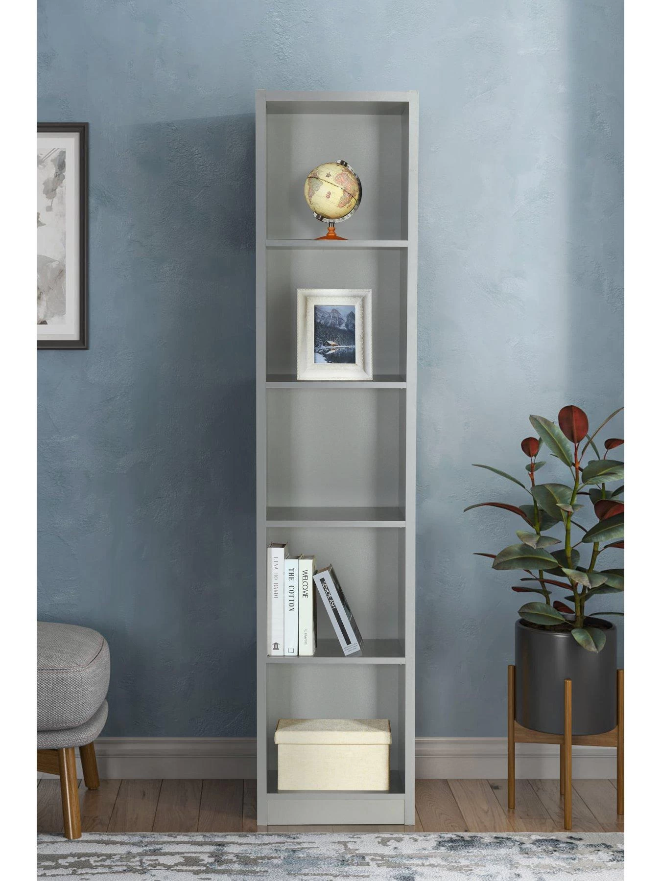 Finished in a smooth grey shade, this bookcase has a tall, narrow design that gives you plenty of display space on a relatively small footprint, so it’s just right for smaller rooms.