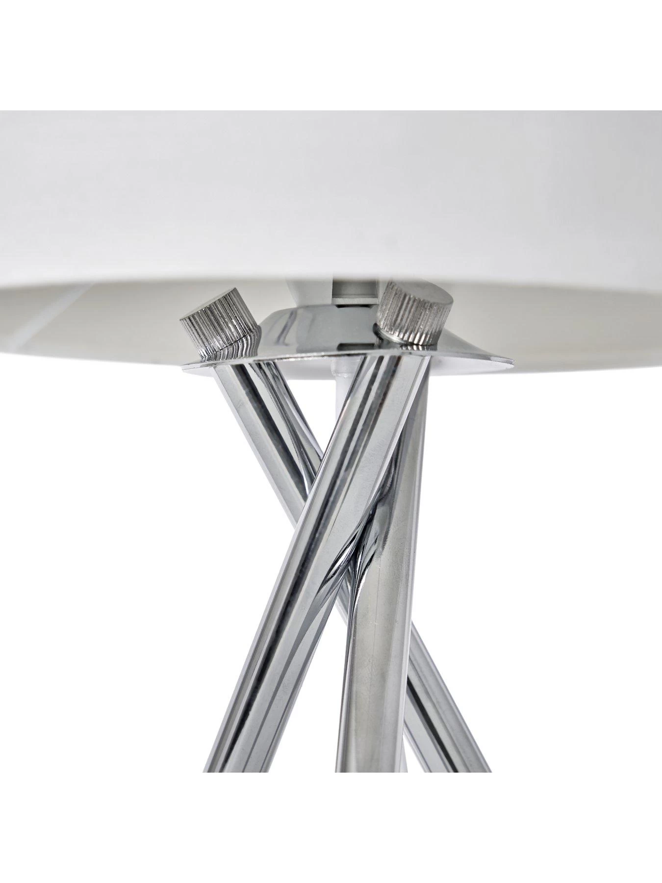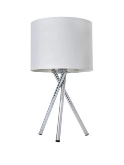 Taking the tripod design and updating it with a modern twist, the three sleek chrome legs criss-cross one another for a striking appearance, while the fabric shade comes in a neutral ivory hue that softly diffuses the light as it passes through. Please note: bulb not included.