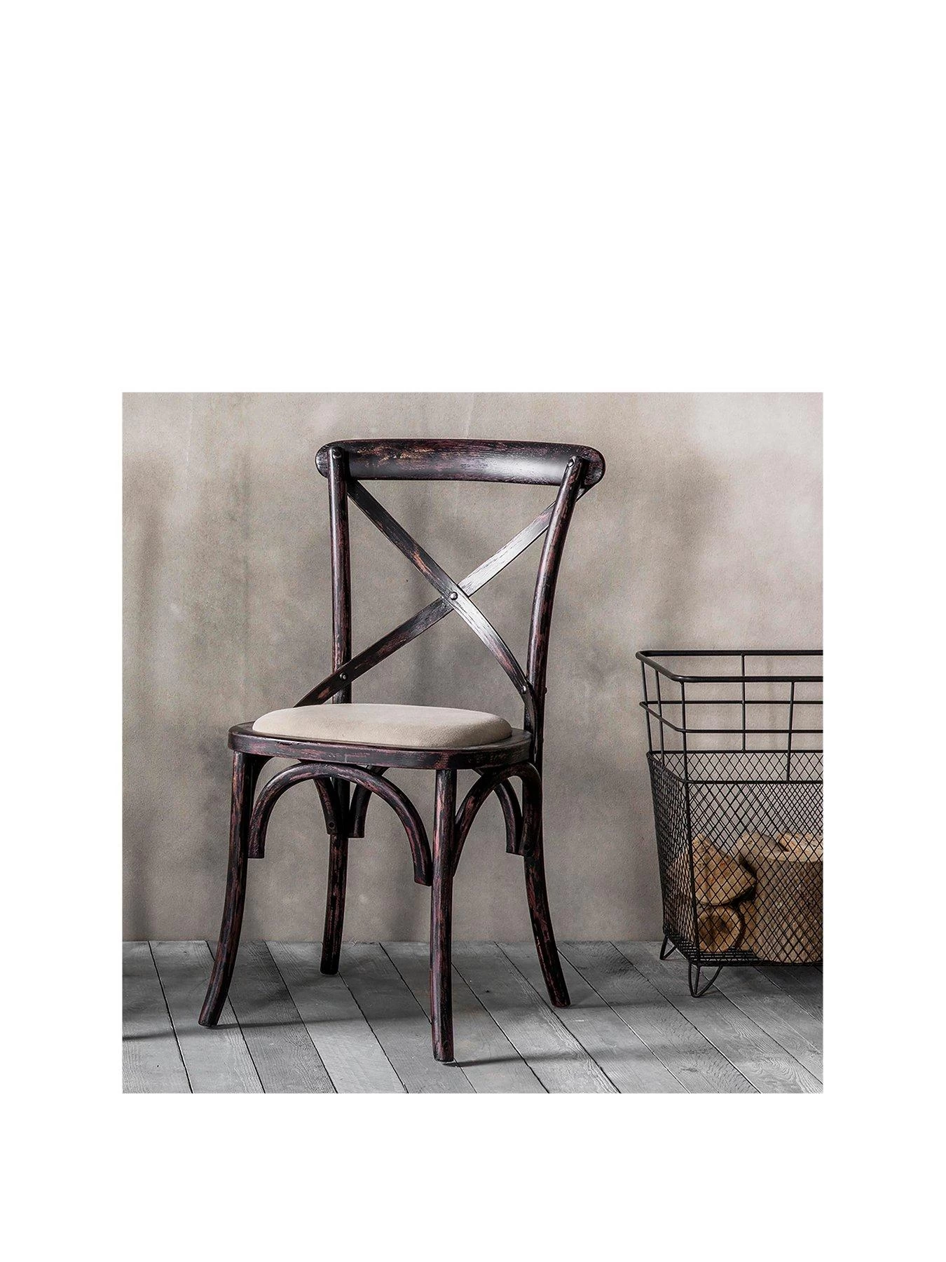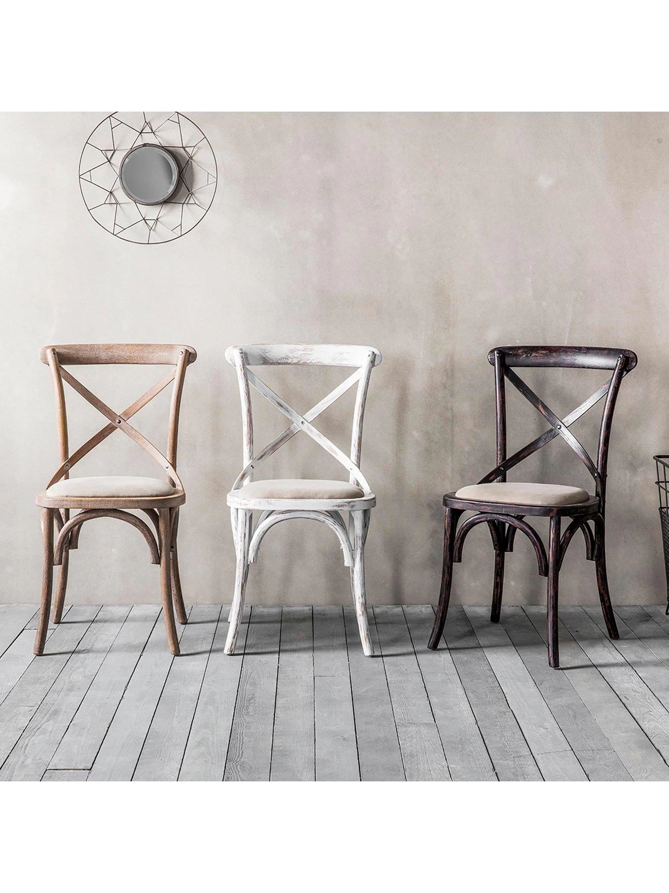 Lovingly crafted from a black distressed oak which gives them a lived-in look, they’re styled with a classic cross back design, with a curved back rest for added comfort. The comfy seat pads are wrapped in a natural coloured canvas for an eye-catching contrast.