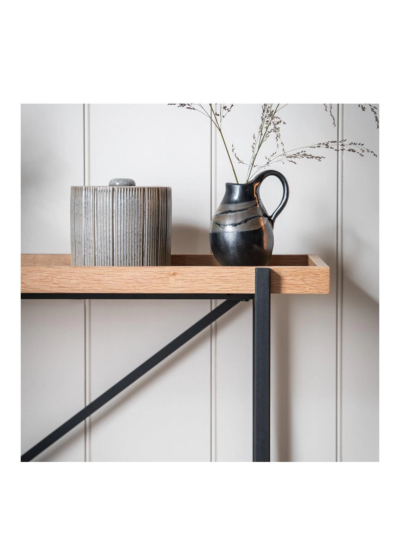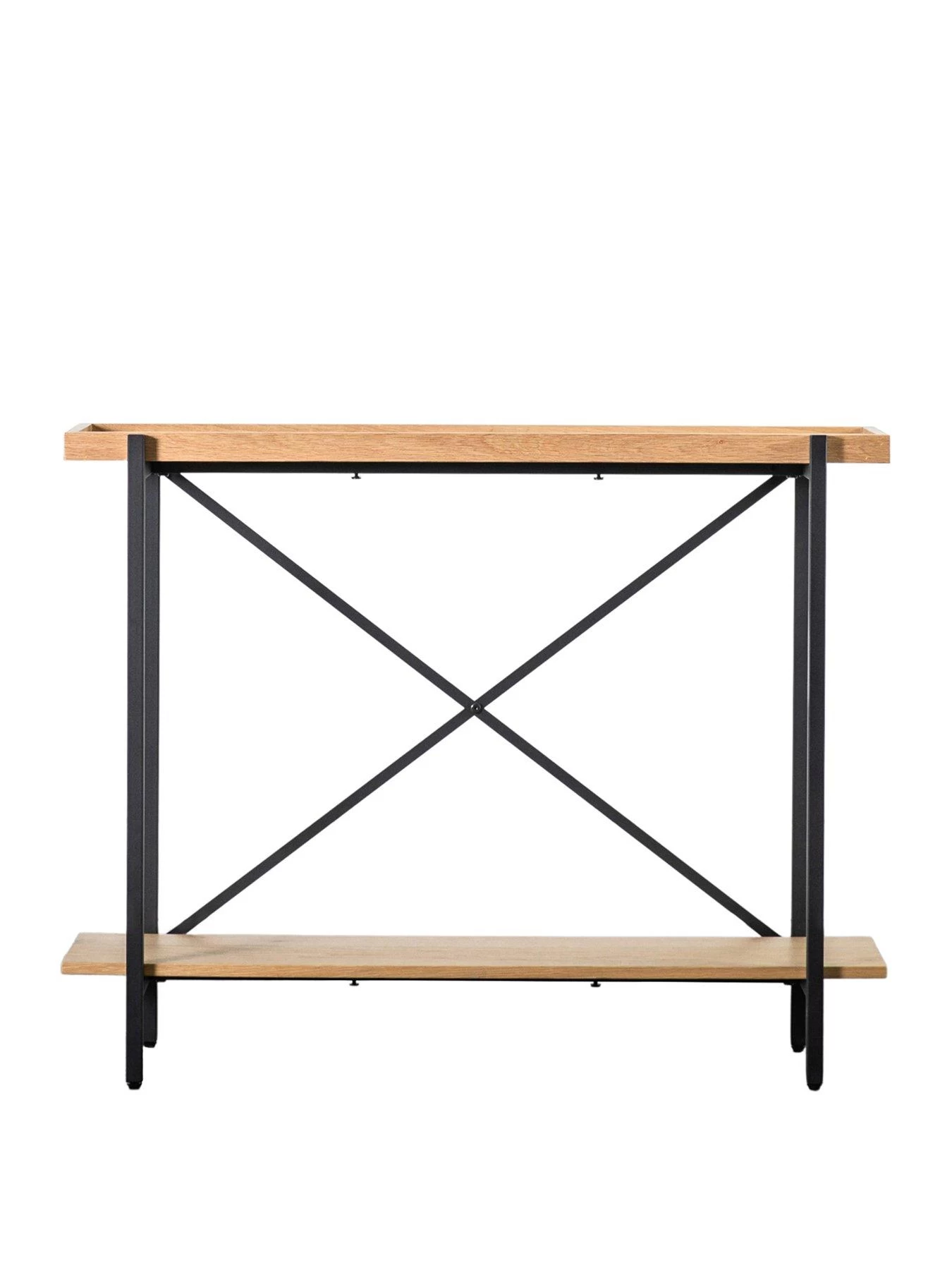 Offering a stunning contemporary look, this console table combines matt black metal with oak. The table top and shelf are tray-style with oak veneer tops and solid oak surrounds. Matching pieces are available. Part of our Packed-Flat Design Project, offering easy delivery to any room in any property, whilst reducing the packaging needed. Easy assembly is required, but all the tools needed are supplied.