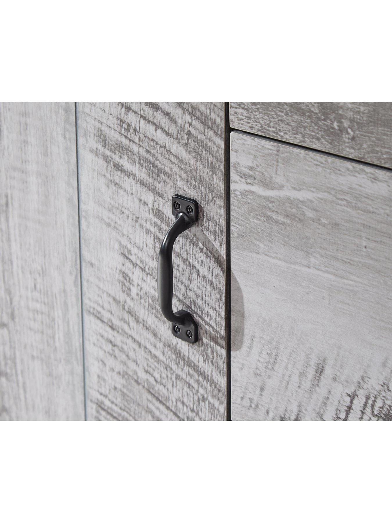 It gets its industrial style from a grey wood-effect to the fronts and sides that’s been given a distressed finish.