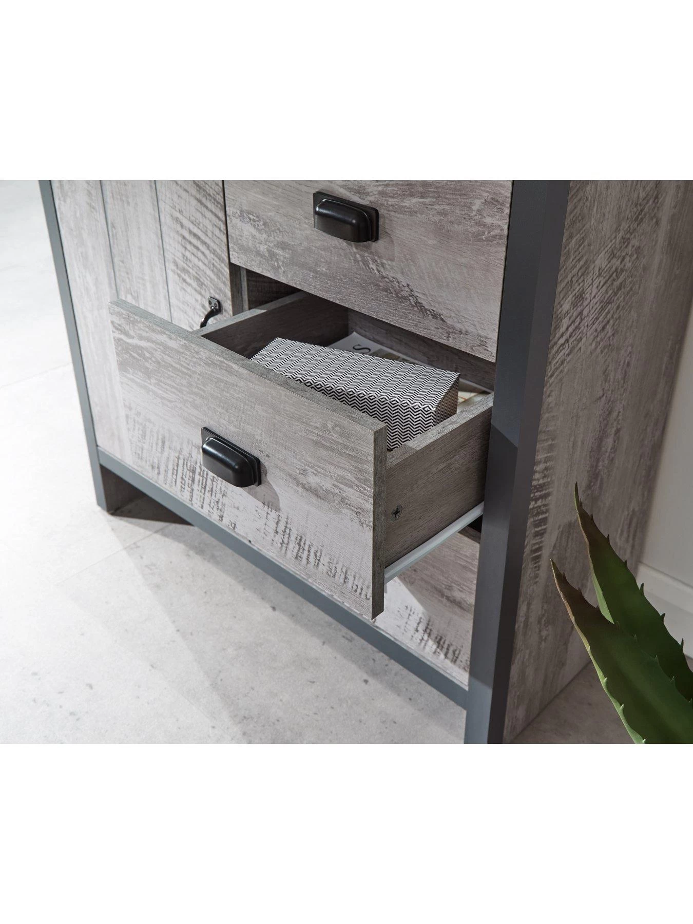 These are bordered by the chunky framing that comes in a solid grey shade. A single door is finished with a curved black metal handle and hides an adjustable shelf to help maximise your storage needs. Three drawers glide smoothly open on metal runners and they’re fitted with black metal cup handles.