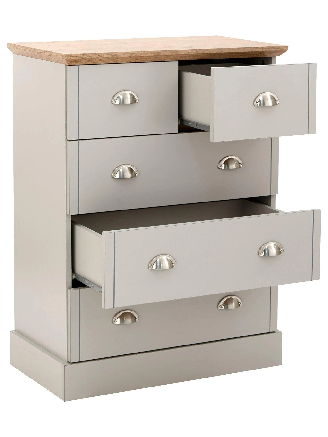 Part of the Kendal collection of bedroom furniture, this chest of drawers comes in a smooth grey finish and features a contrasting oak-effect top with a bevelled edge.