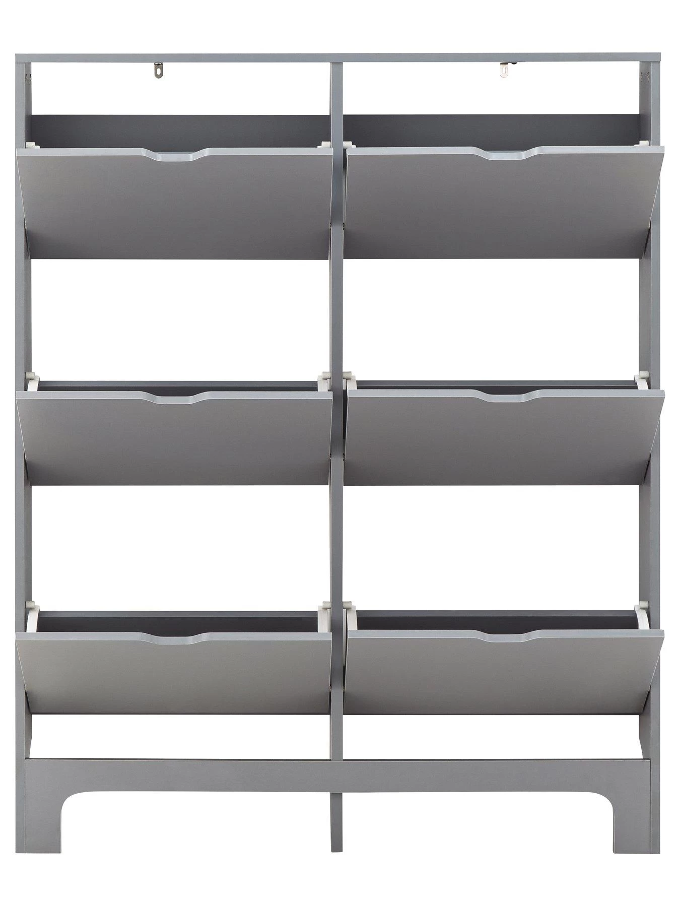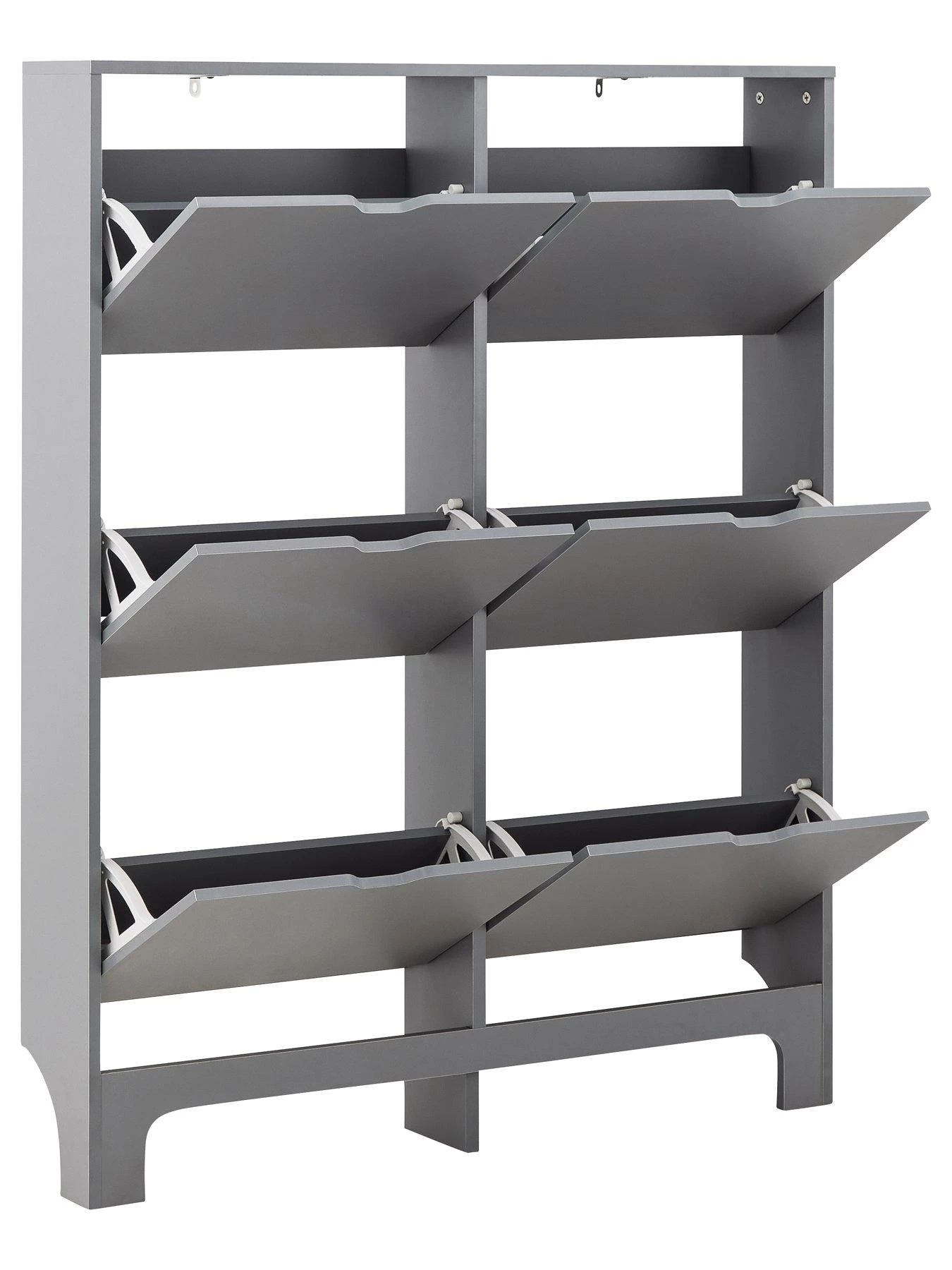 Measuring just 17 cm in depth, it’s ideal for narrow walkways and space, and is finished in a smooth matt grey painted frame. Six flip-down compartments provide enough space for up to 12 pairs of standard sized men’s shoes.