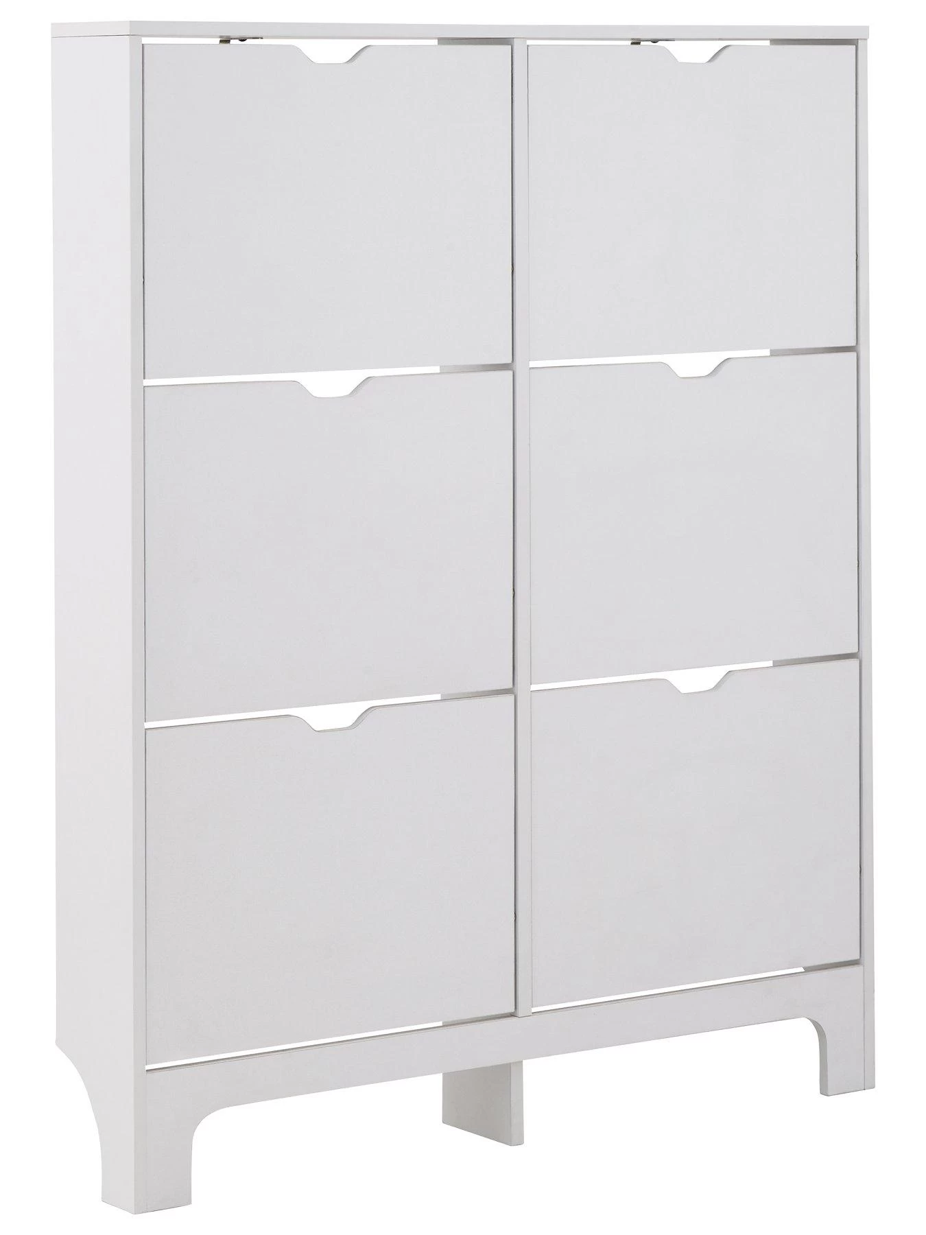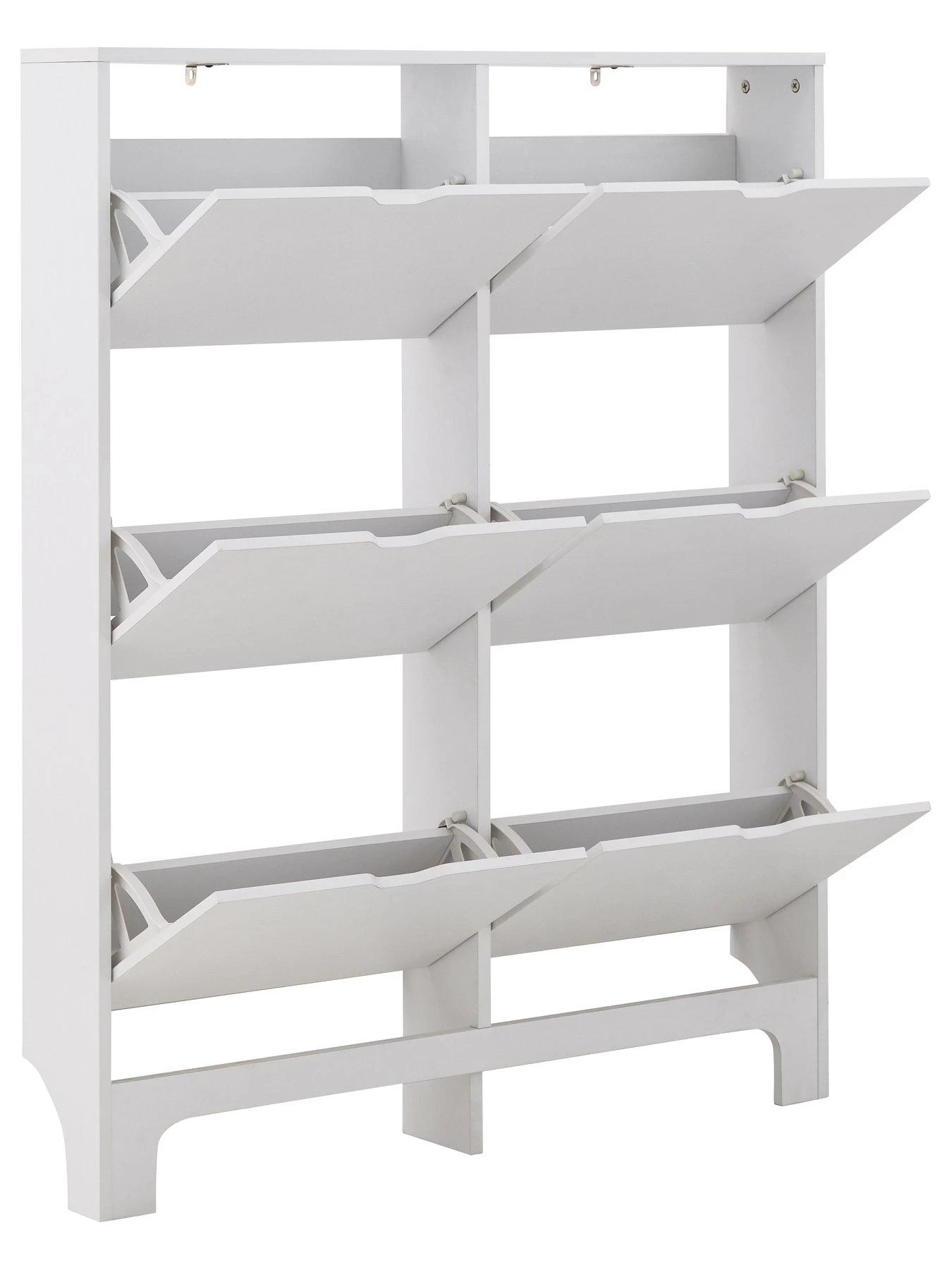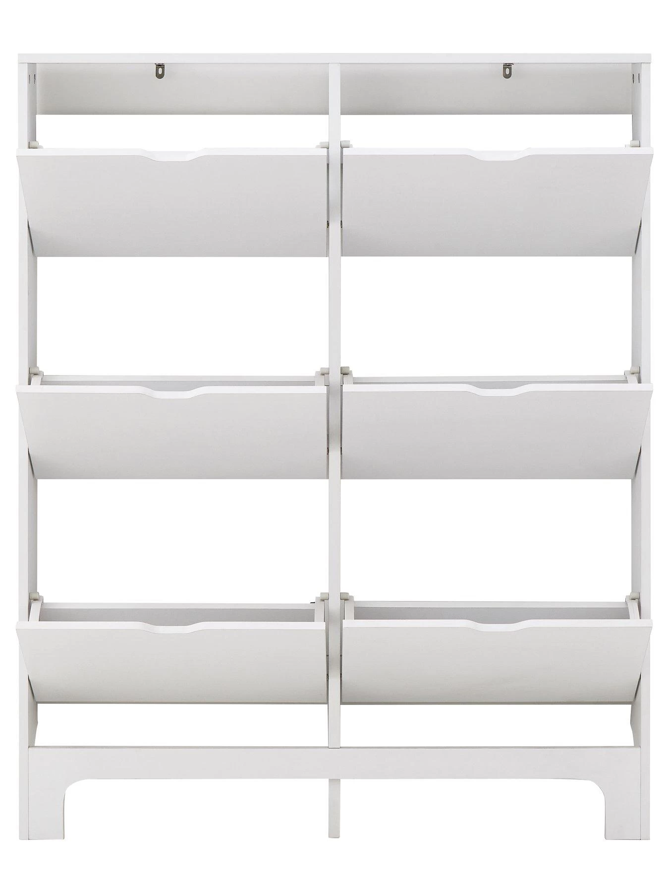 Measuring just 17 cm in depth, it’s ideal for narrow walkways and space, and is finished in a smooth matt white painted frame. Six flip-down compartments provide enough space for up to 12 pairs of standard sized men’s shoes.