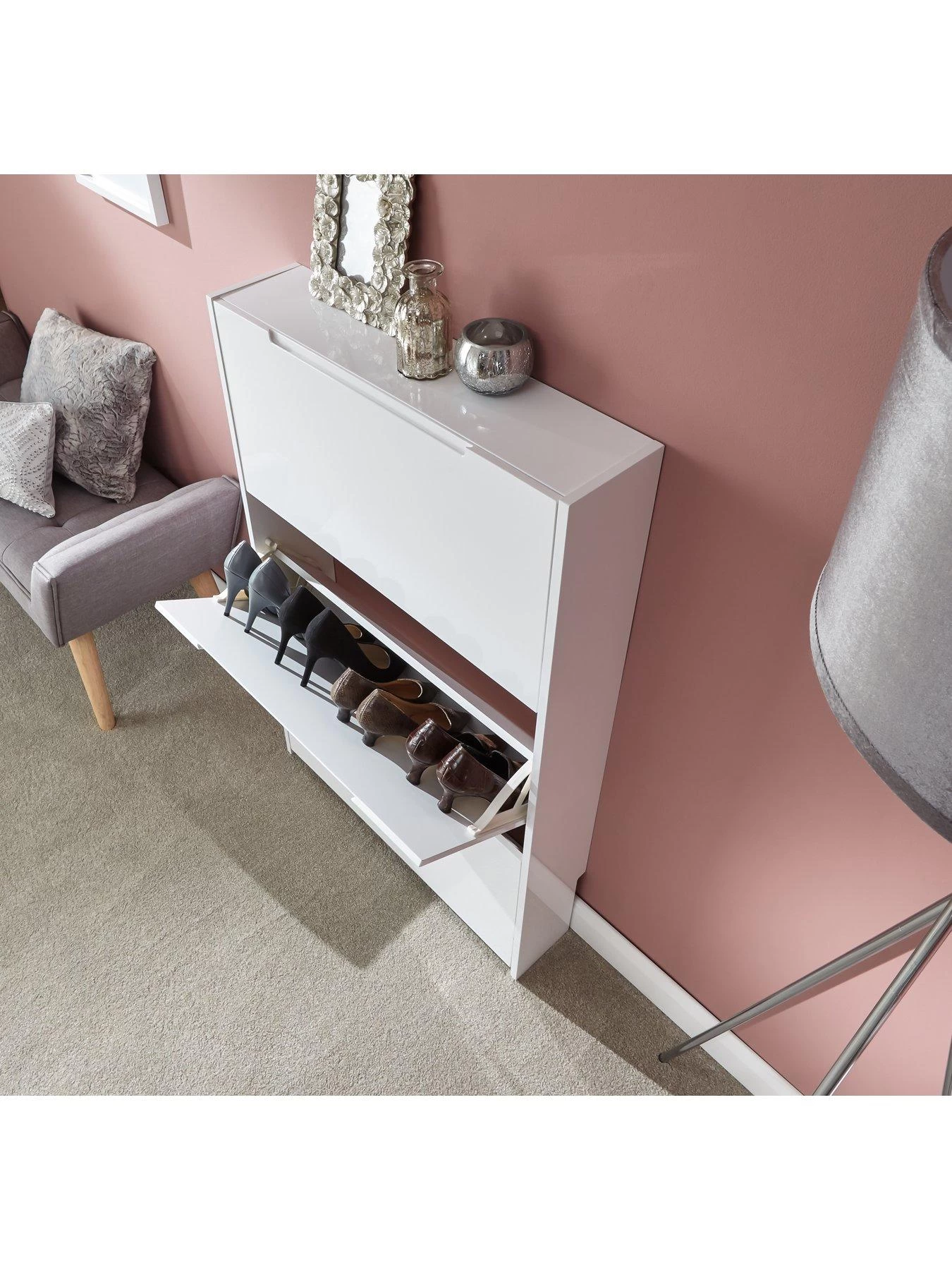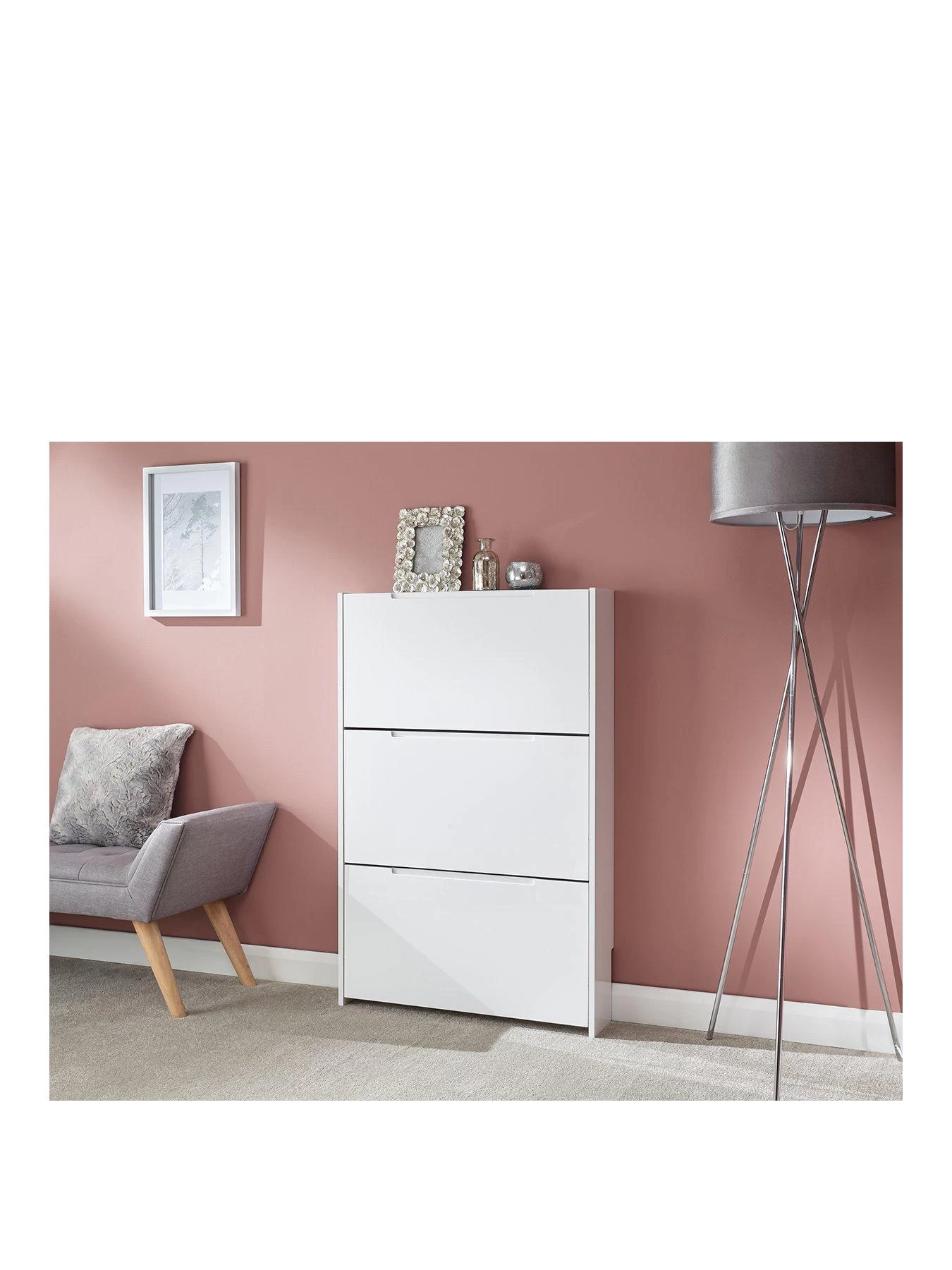 The base is profiled so it sits smartly over your skirting board, against the wall, and the three flip down compartments each hold three pairs of standard sized men’s shoes. recessed handles help maintain the sleek high gloss finish, while the top can be used as a display space to show off pictures, ornaments and more.