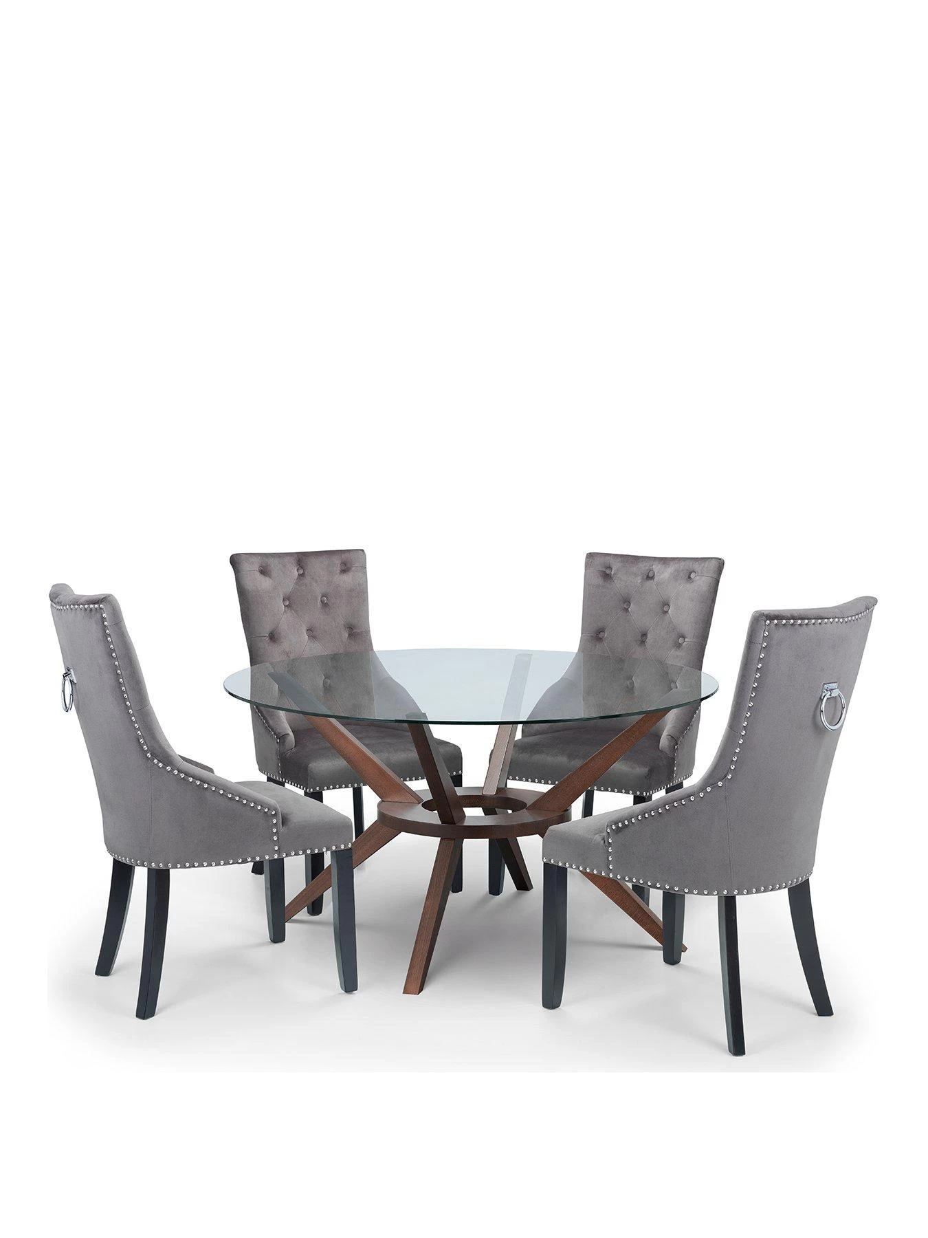 A truly stunning 140cm circular dining table featuring an elegantly styled solid wood base in walnut finish, topped with a substantial tempered glass top ????to create an exquisite contemporary piece that will take pride of place in any home. This set inlcudes 4 Veneto Dining Chairs. upholstered in a soft touch luxurious grey velvet fabric, featuring????a metal ring detail on the back along with glamourous deep buttoning and a metal stud trim