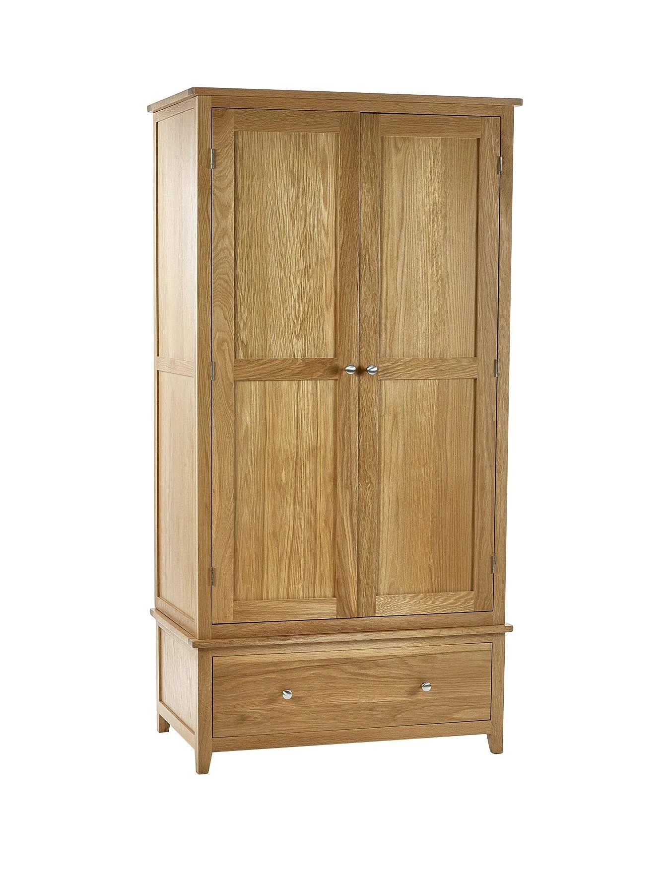 Crafted from solid oak and oak veneers the Mallory Combination Wardrobe ensures style and lasting durability. Featuring a spacious double door design and an additional drawer, this wardrobe provides plenty of storage for clothing. Finished with round silver knobs, perfect for any bedroom space.