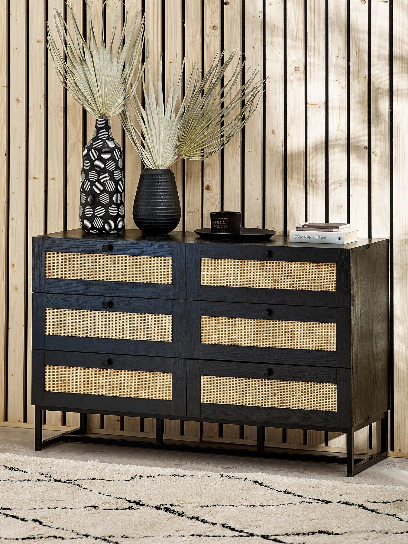 You can pick either oak or grained black to suit the colour scheme of your space, and each one features breathtaking rattan panels to the drawer fronts. The natural rattan gives the furniture a unique and airy appearance that contrasts stunningly against the industrial-inspired metal base.