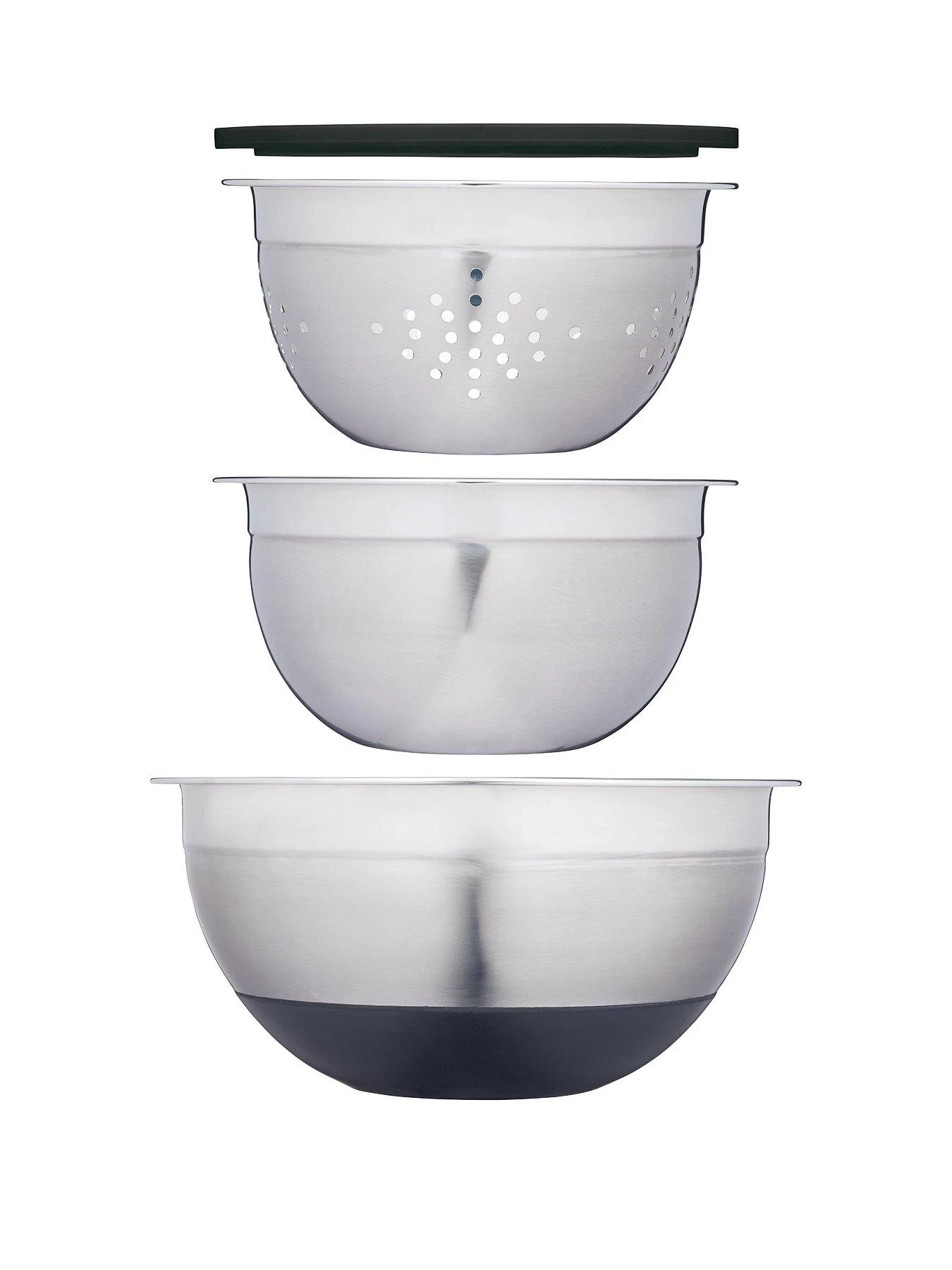 Made from stainless steel, each piece has clever features that make them incredibly useful. The 23.5 cm bowl has a non-slip base for easier mixing of ingredients, while the 18 cm colander has a lip that makes it easier to grip when held under running water. A lid is also included which fits over the 18 cm bowl to create an airtight seal that keeps food fresher for longer. The whole set is fridge, freezer and dishwasher safe for added convenience too.
