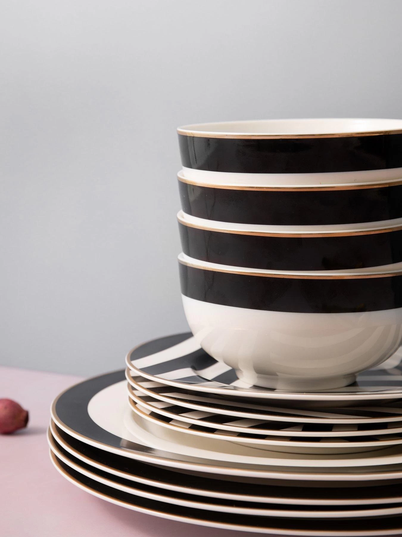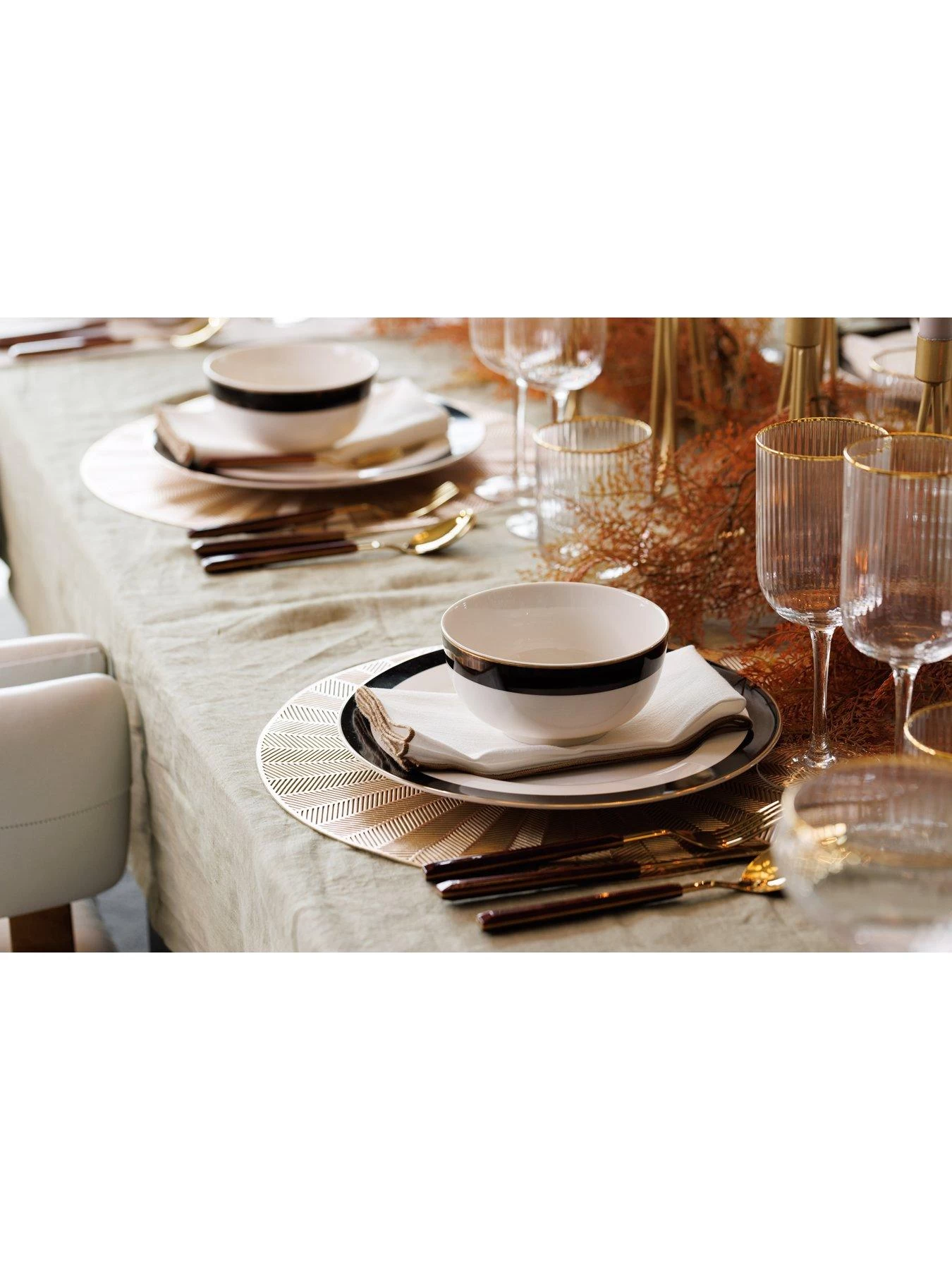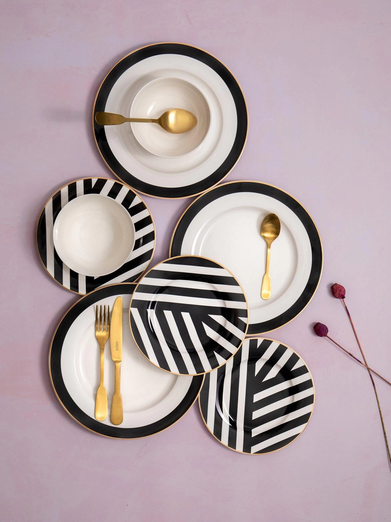 Beautifully made from delicate fine china, each piece demands the attention with an Art Deco-inspired geometric print in a monochrome palette. A genuine gold rim gives the plates and bowls a subtle sparkle that enhances the luxury looks. It’s the ideal set for entertaining, transforming a simple meal with loved ones into a showstopping special occasion.