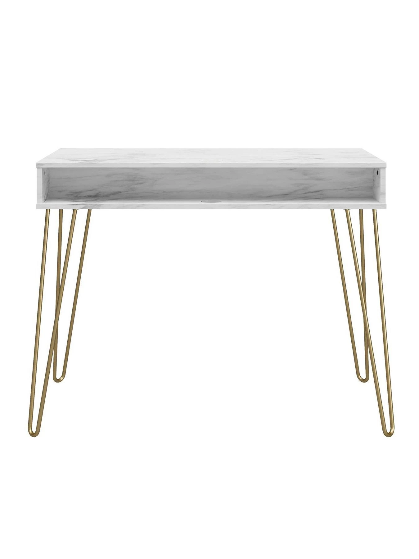 It’s finished in a stunning white marble-effect that’s rich in those distinctive veins and swirls, while the area under the desk contains two open cubbies for keeping stationery and more close-to-hand. This drawer-free design results in an uncluttered appearance, an effect that’s heightened by the trendy slimline metal hairpin legs – all wrapped in a rich gold shade.