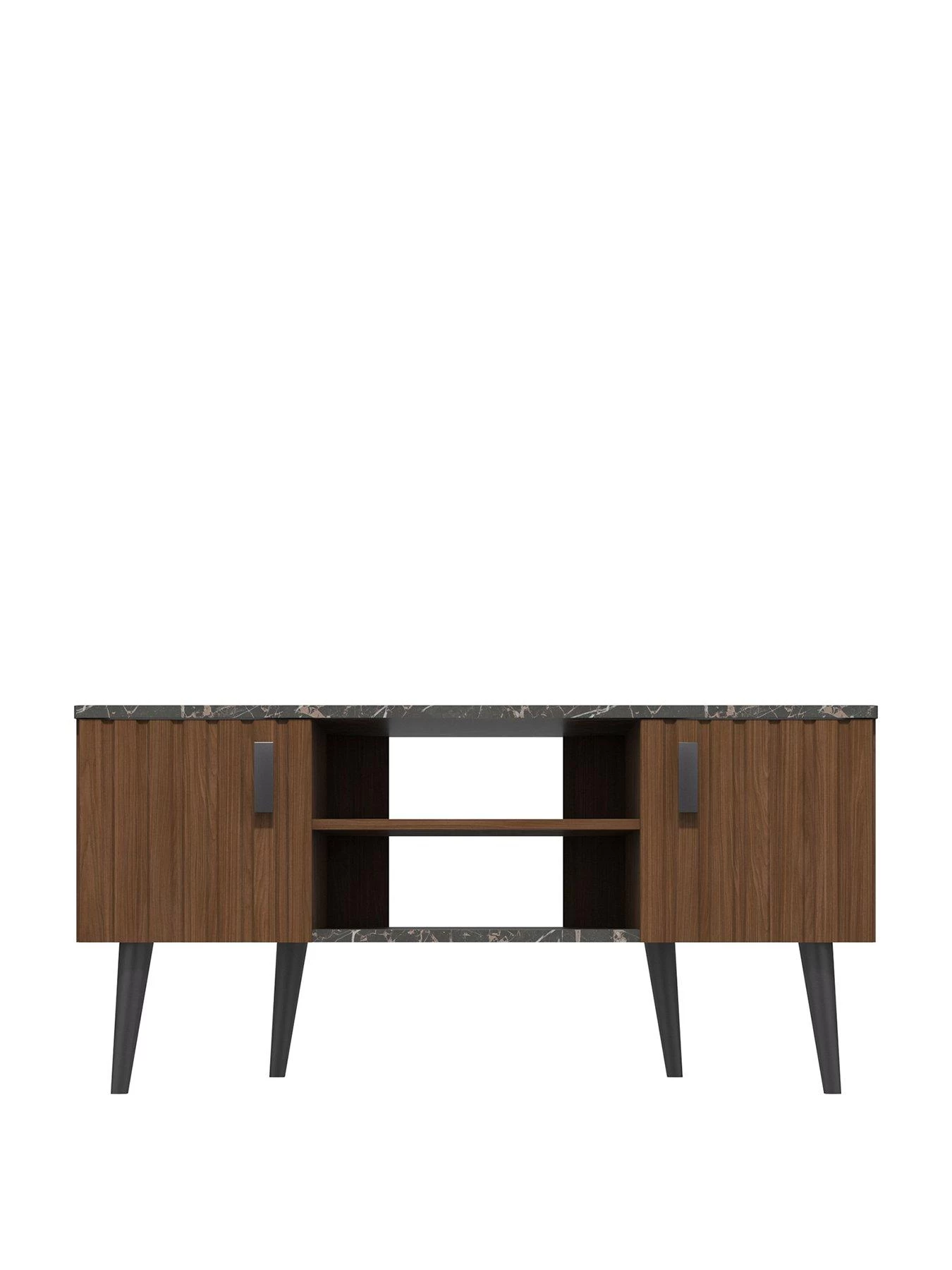 Two storage cupboards are a handy hideaway for DVDs, video games and remotes, while the open shelving at the centre stylishly shows off your AV equipment and allows wires to pass neatly through the back.