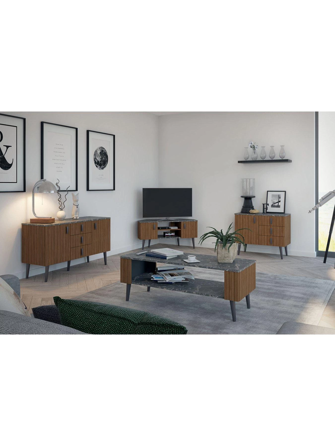 The mid-century modern overtones are highlighted by a stunning walnut-effect finish that features a ribbed design. These chunky ridges create a rich texture that helps draw attention to the dark grain detail, ensuring the furniture never goes unnoticed.