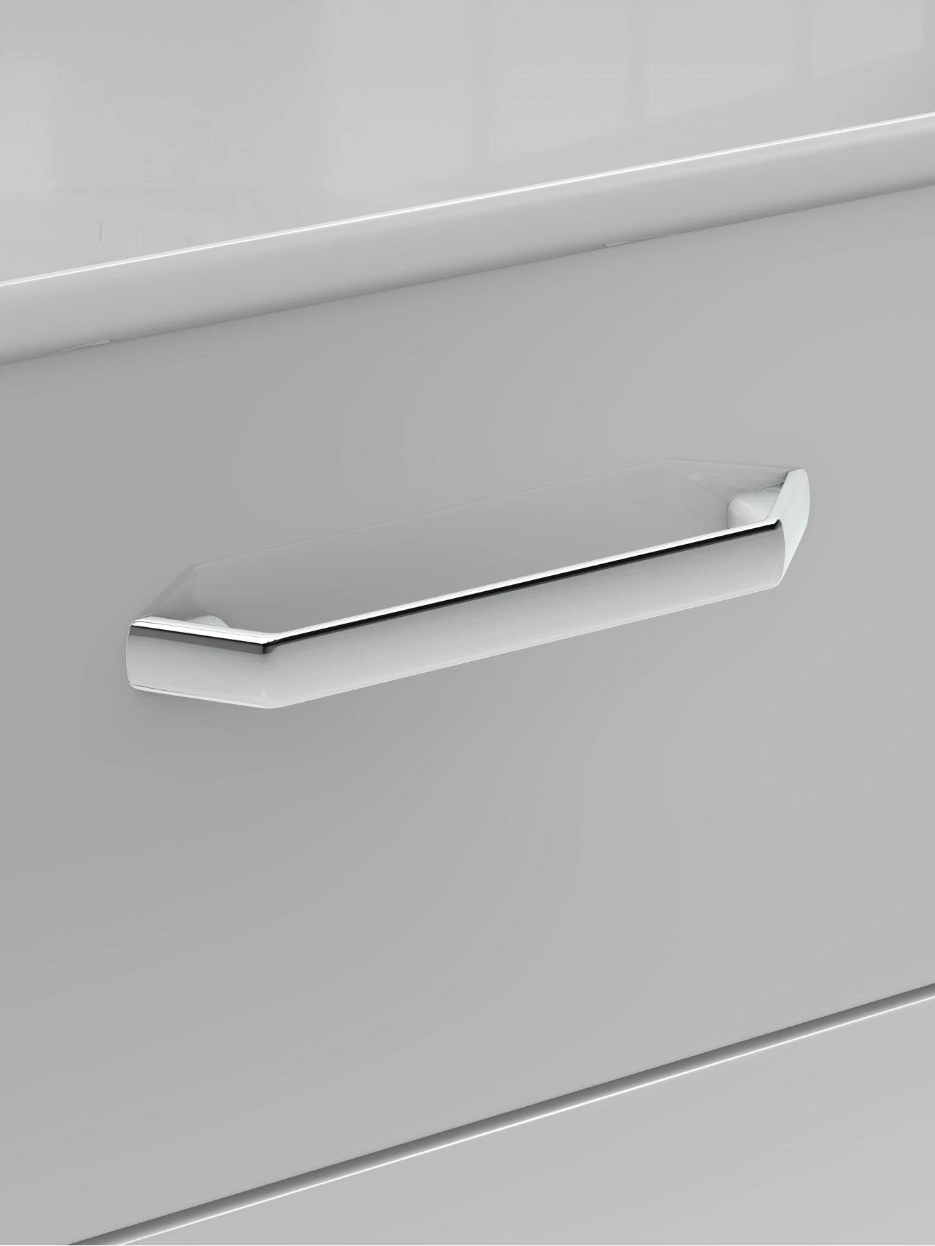 This ultra modern ready assembled bedside chest flaunts a fashionable high gloss finish that ensures the soft colour choice of light grey, dark grey and white really pops. Accented with light-catching designer metal handles, the three storage drawers will glide quietly open on metal runners.