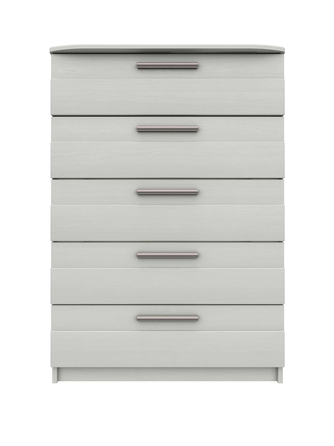 Styled with a rounded front edge to the top, the five drawer fronts are finished with a tongue-and-groove style finish and modern metal handles that put some shine into your sleep space.