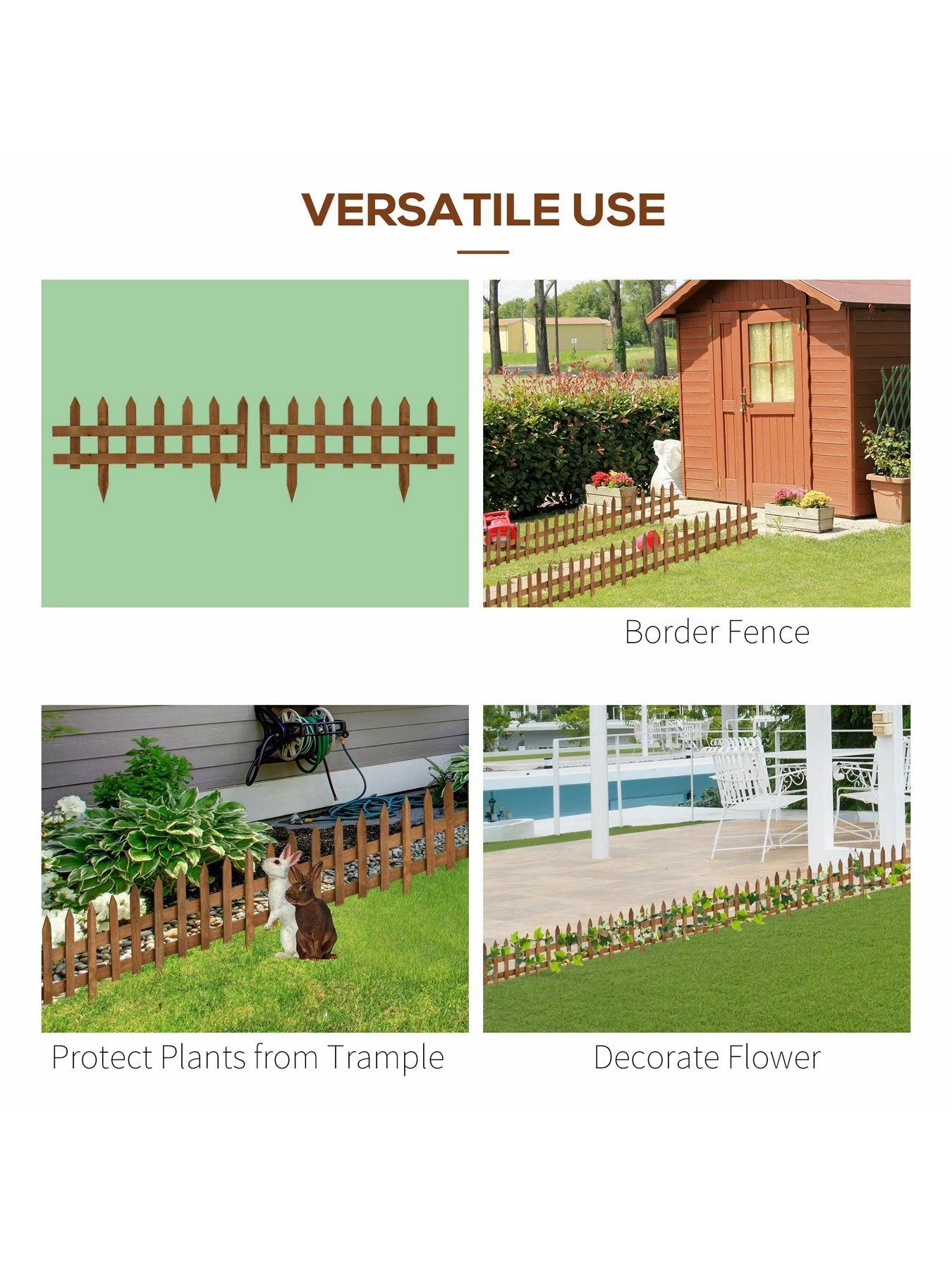 This practical Outsunny garden fence decorates your garden and protects your plants. These 12 fence secions can be used in different shapes, such as straight, square or circle, to meet different requirements. Made of natural fir wood with specially treated surface, the wooden plant border fence is durable and solid. Placed either in flowerbeds or lawn edging, the decorative fence will be an eye-catching addition to your garden.