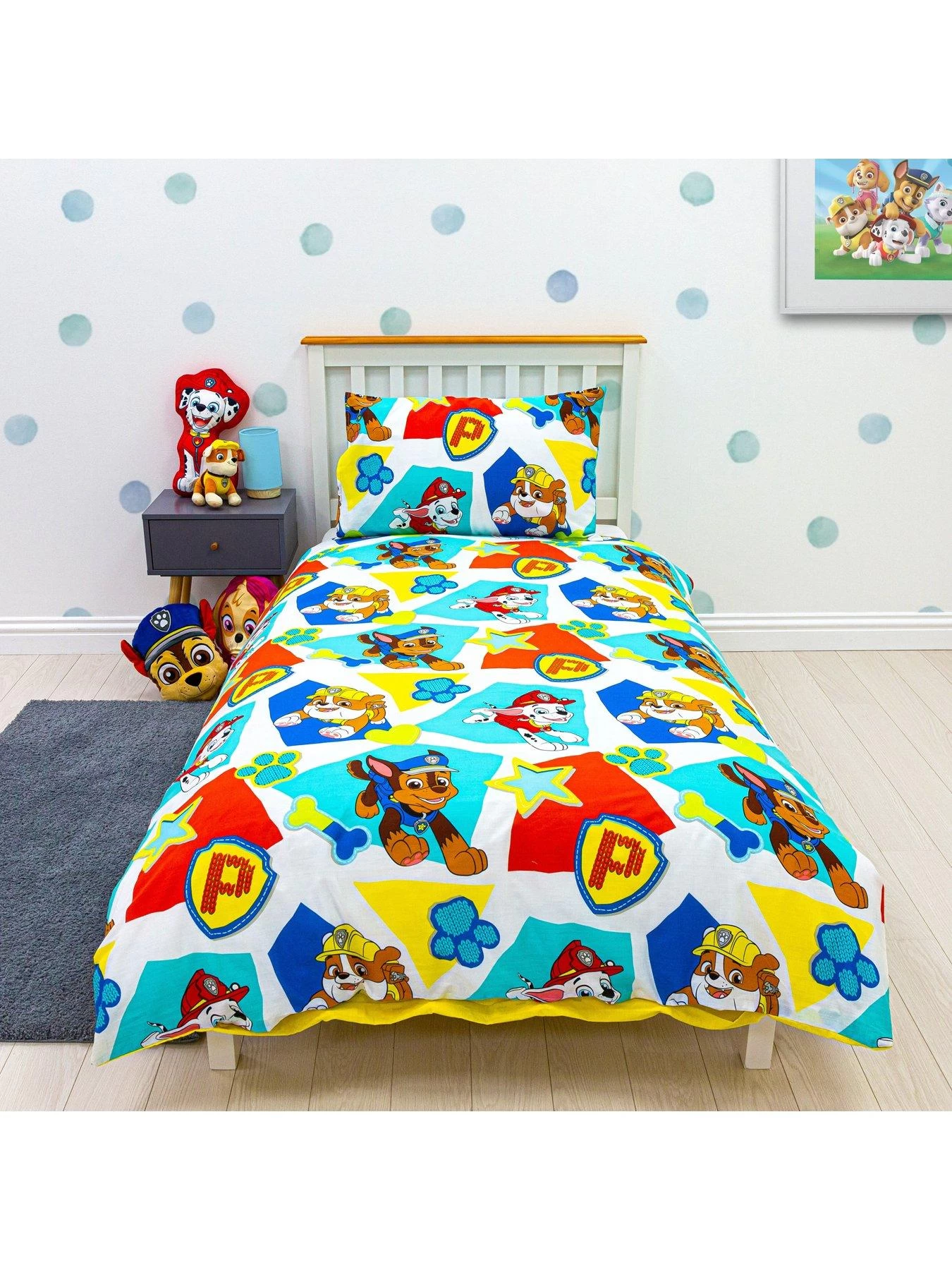 Roll into bedtime with this bright and colourful single Paw Patrol duvet! The colourful design showcasing furry favourites Marshall, Chase, and Rubble along with Skye and Everest. With a repeating pattern on the reverse this cosy duvet set is the perfect addition to your little pup’s bedtime routine!
