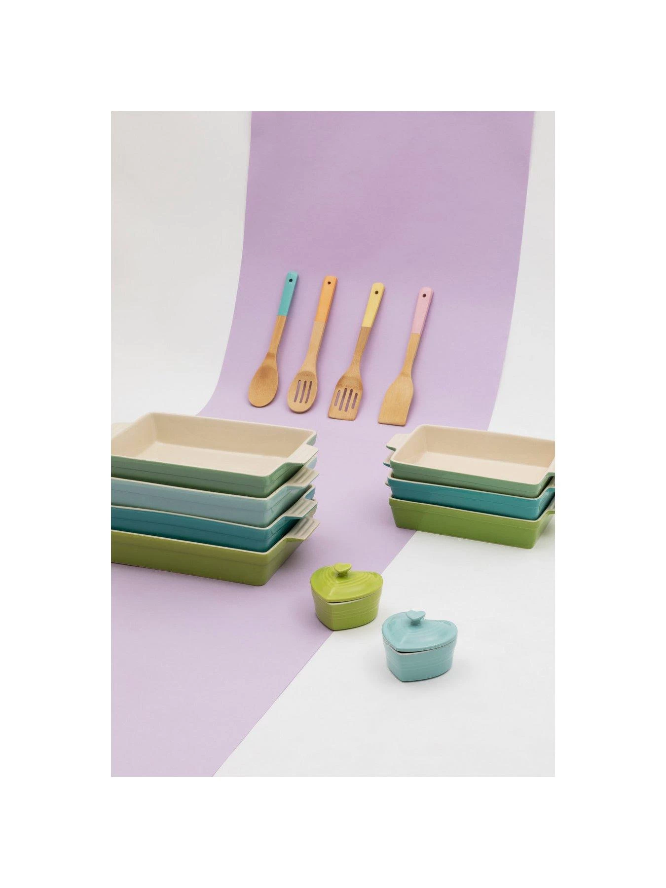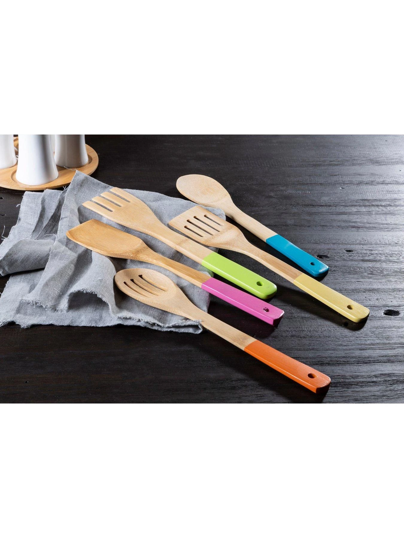 - A colourful five piece kitchen utensil set that complements pastel-toned décor.
