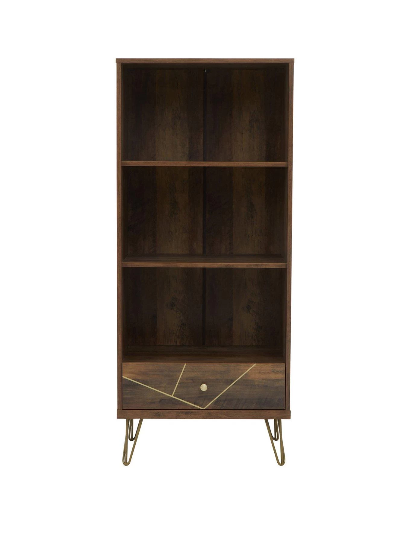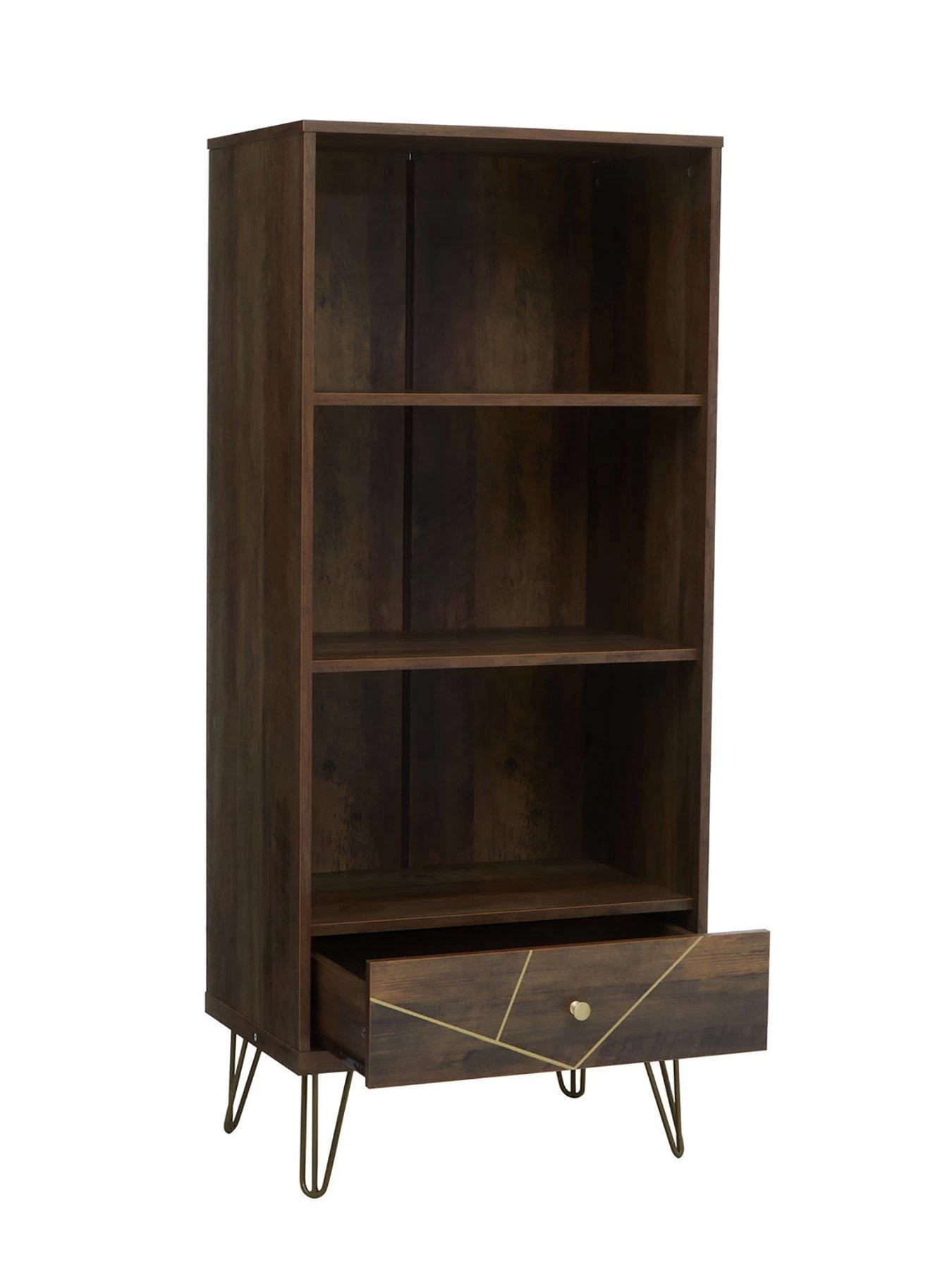 This storage unit is encased with a wood veneering effect and supported by hairpin metal legs in a warm metallic finish. The three shelves and a drawer of this storage unit provide ample space for storing and showcasing decoration pieces and books.