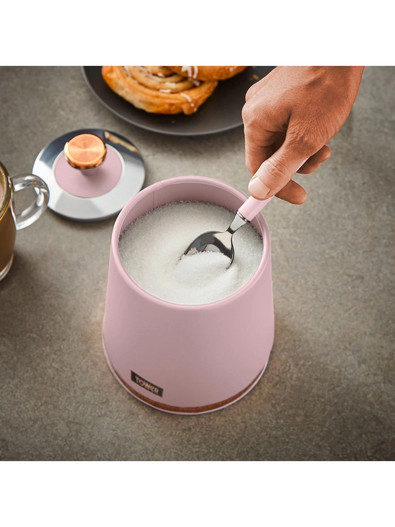 Stunning in pink and complimented by metallic rose gold highlights, each one has a dramatic silhouette which is a love letter to the bold beauty of art deco design. Carbon steel construction gives plenty of durability, and the 10.5 x 18.5 x 13.5 cm size means they’re large enough for your cuppa essentials – teabags, coffee and sugar.
