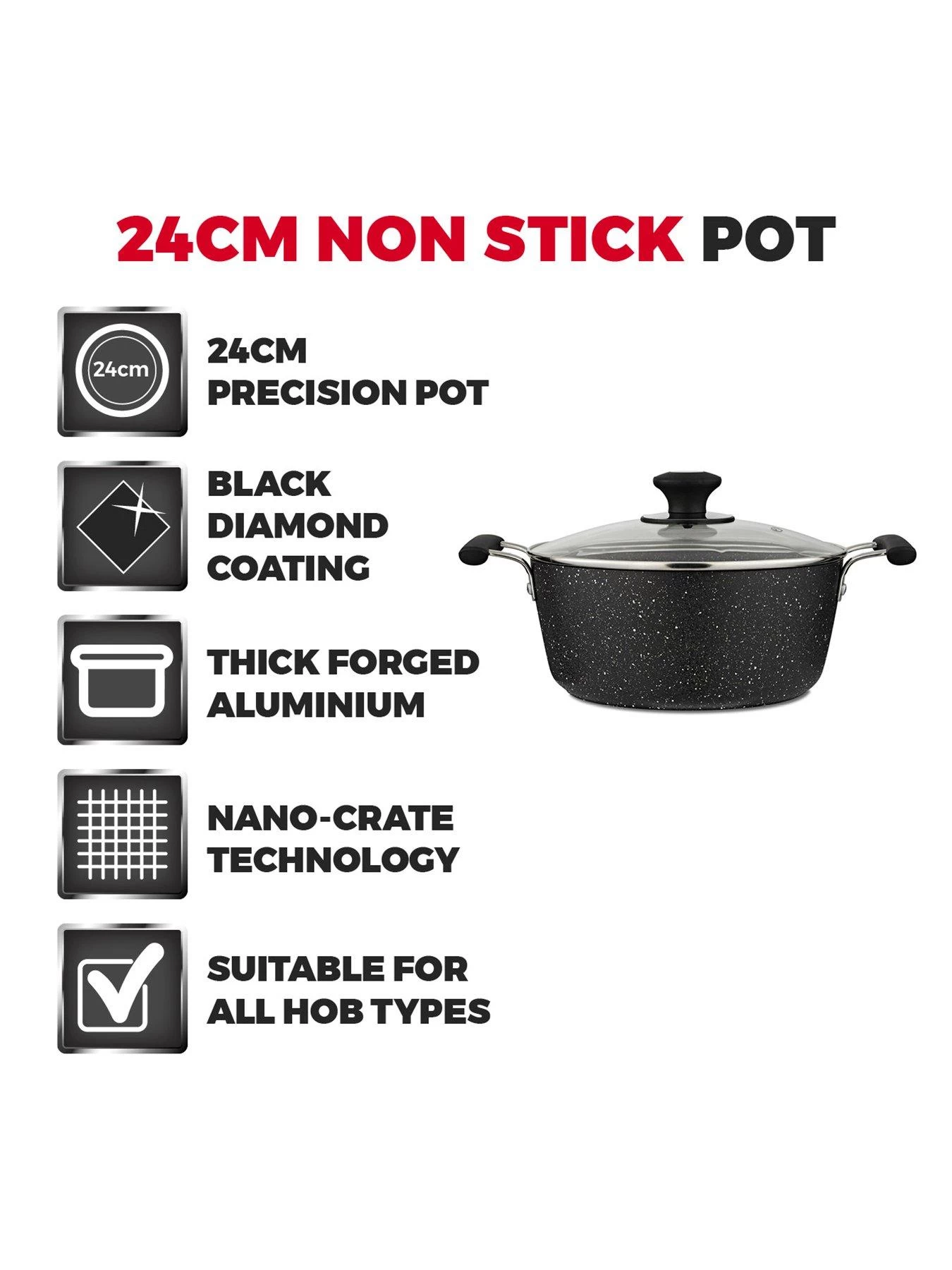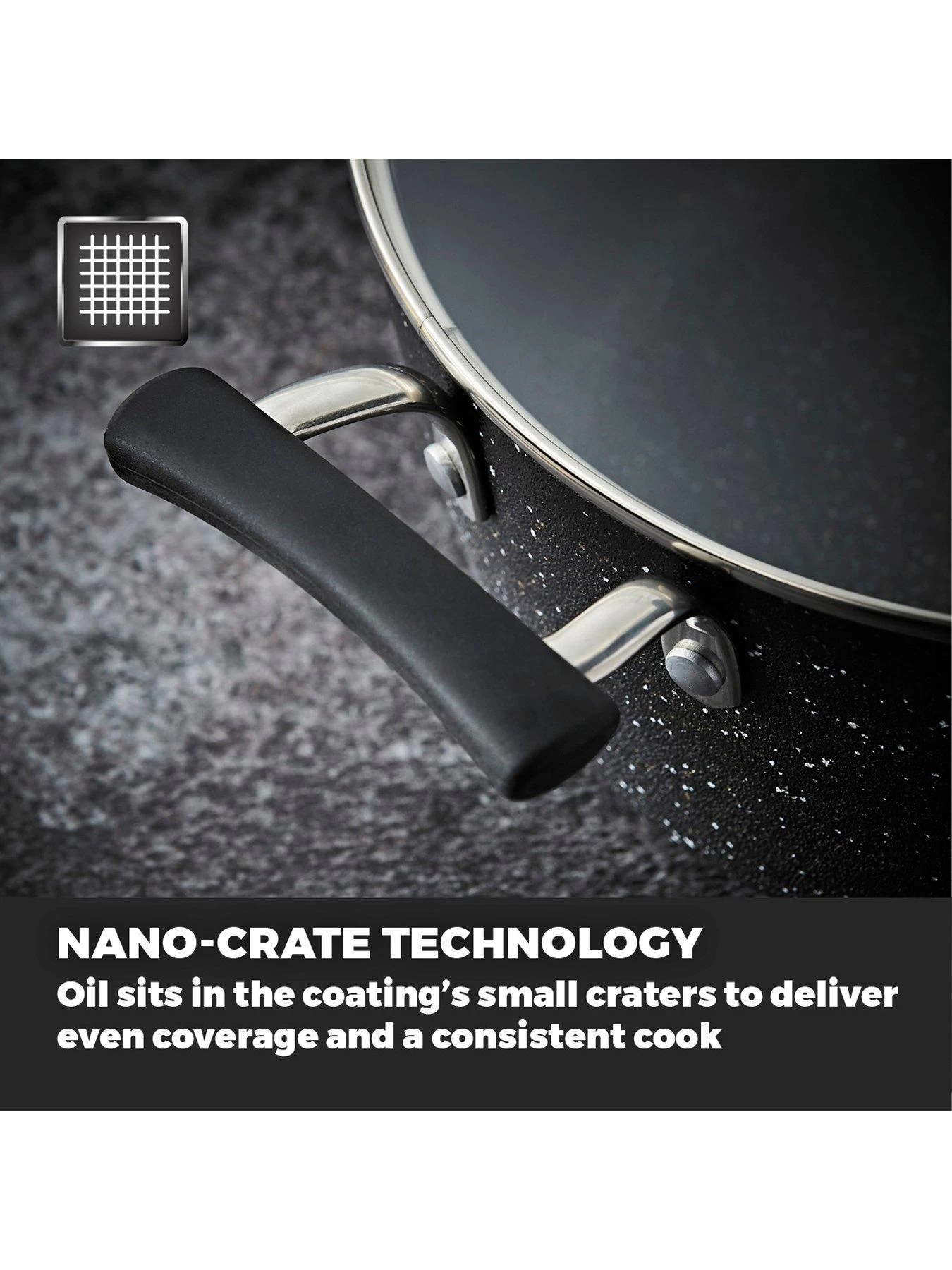 It also benefits from an ultra-durable black diamond, stone reinforced non-stick coating – this is 7 times stronger than standard non-stick coatings, so it’s even suitable for use with metal utensils. Nano-crate technology means oil sits in the coating’s tiny ‘craters’, delivering superb coverage across the bottom of the pans and resulting in a more consistent cook.