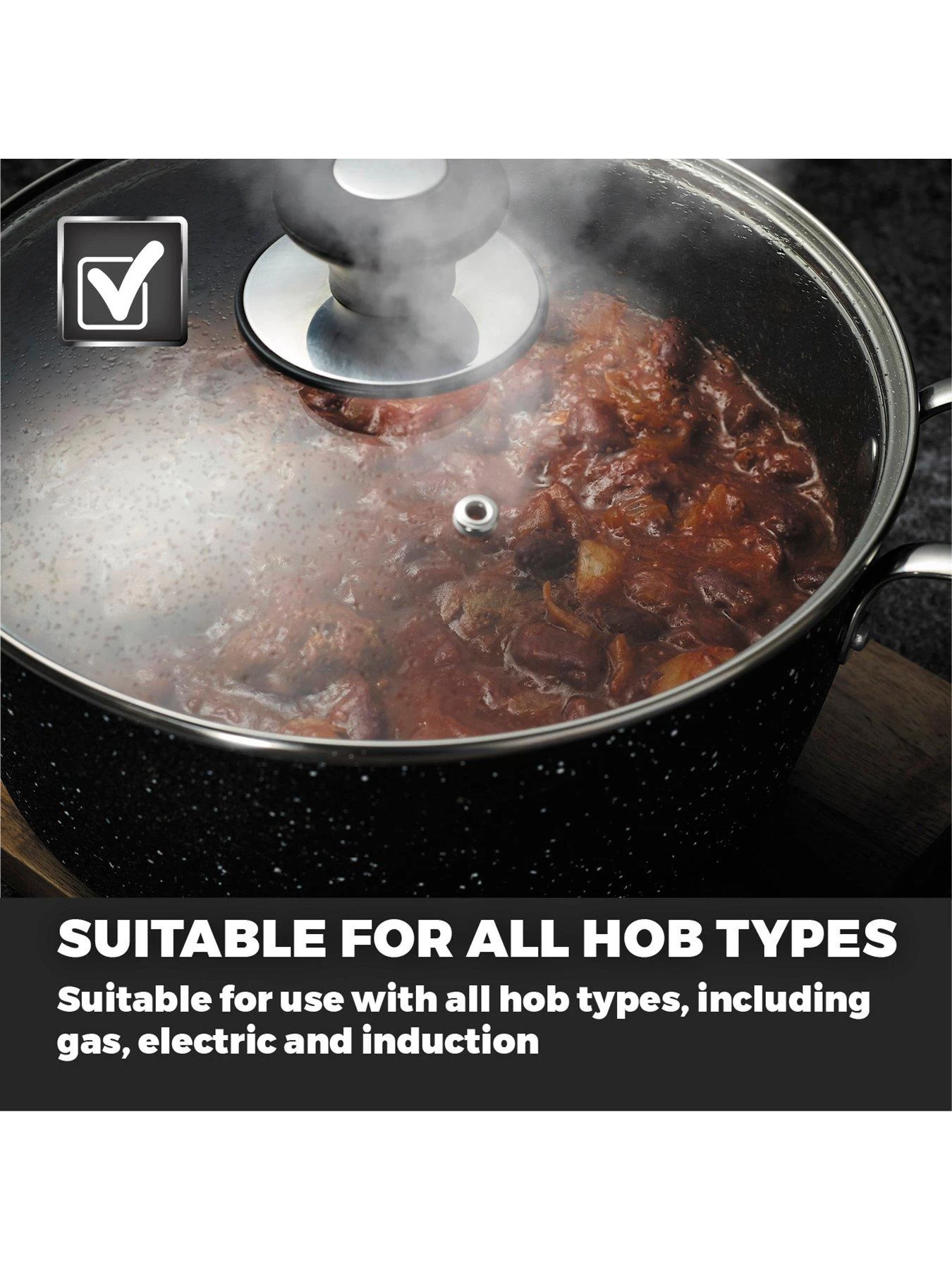 Riveted steel handles provide comfort and control when carrying it to the table, and a vented glass lid allows you to check the progress of your food without the need to remove it. This pot is oven-safe, suitable for all hob types and is safe for dishwasher use.