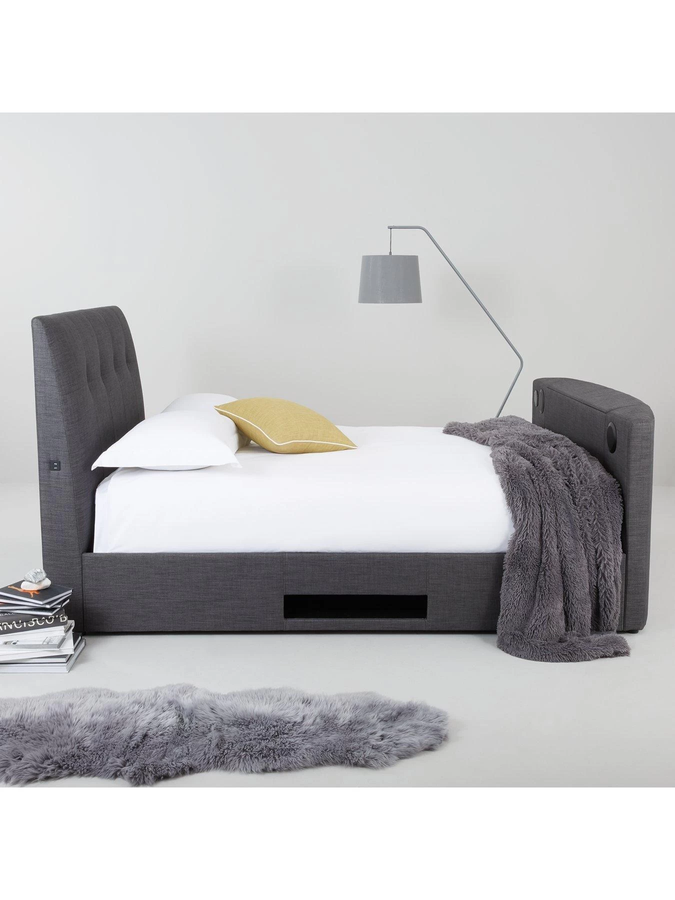 Avelon Fabric Side Lift Ottoman Storage TV Bed with Bluetooth and USB Chargers in Double and King Sizes; plus Memory Saving Mattress Options – suitable for TVs up to 42 inch