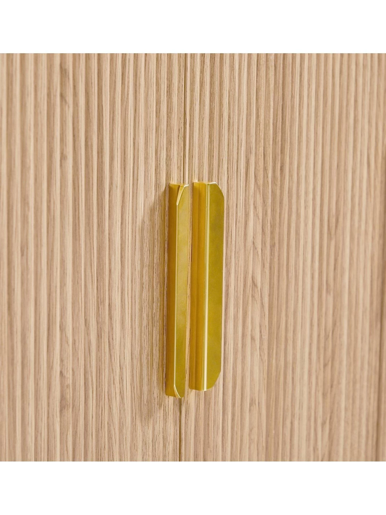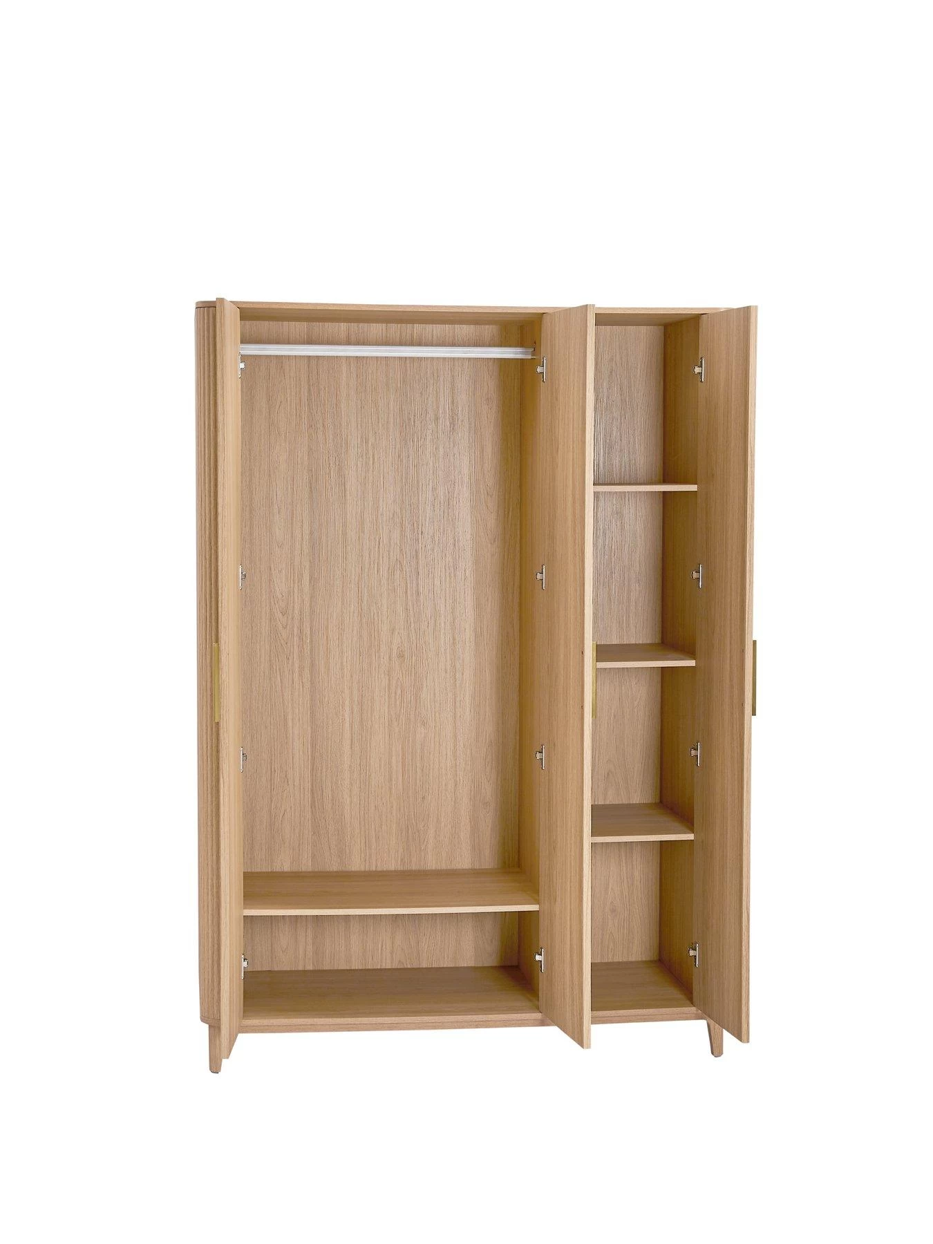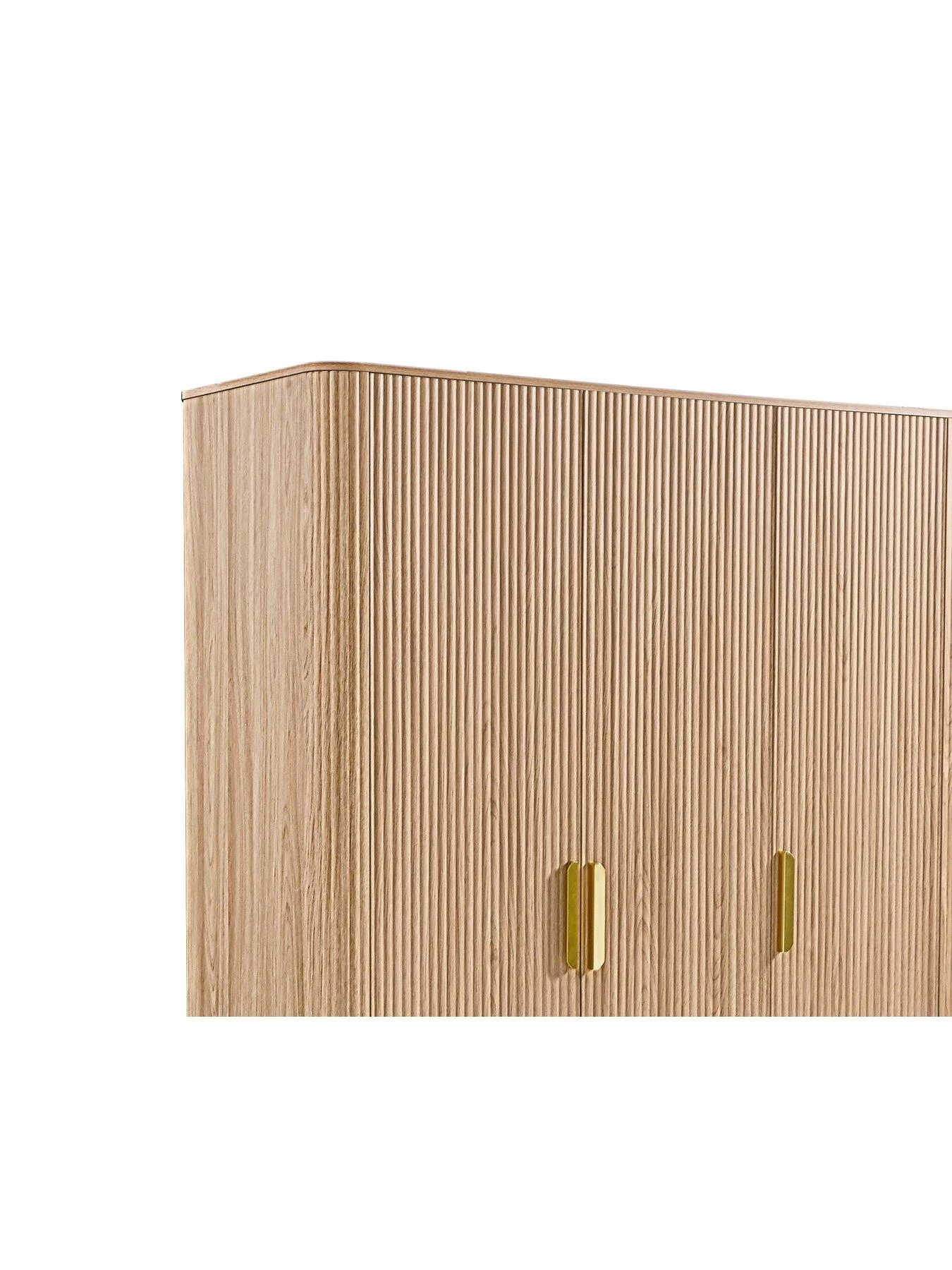 Curved corners echo the smoothness of the rounded ribs, and it’s detailed with large gold coloured handles and Scandi-style splayed feet. Behind the double doors is a hanging rail and low shelf, while the single door hides a series of narrow shelves that are perfect for everything from folded tees to storage baskets.