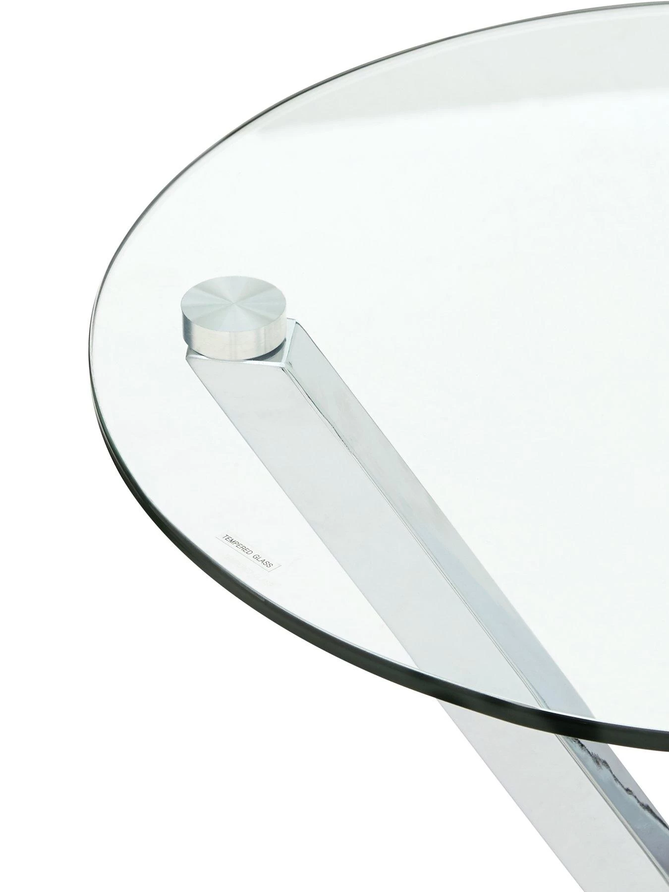 Four cool coloured ‘chopstick’ legs come together at their centre points, creating a striking base, and their sleek shine matched by is a smooth circular glass table top.