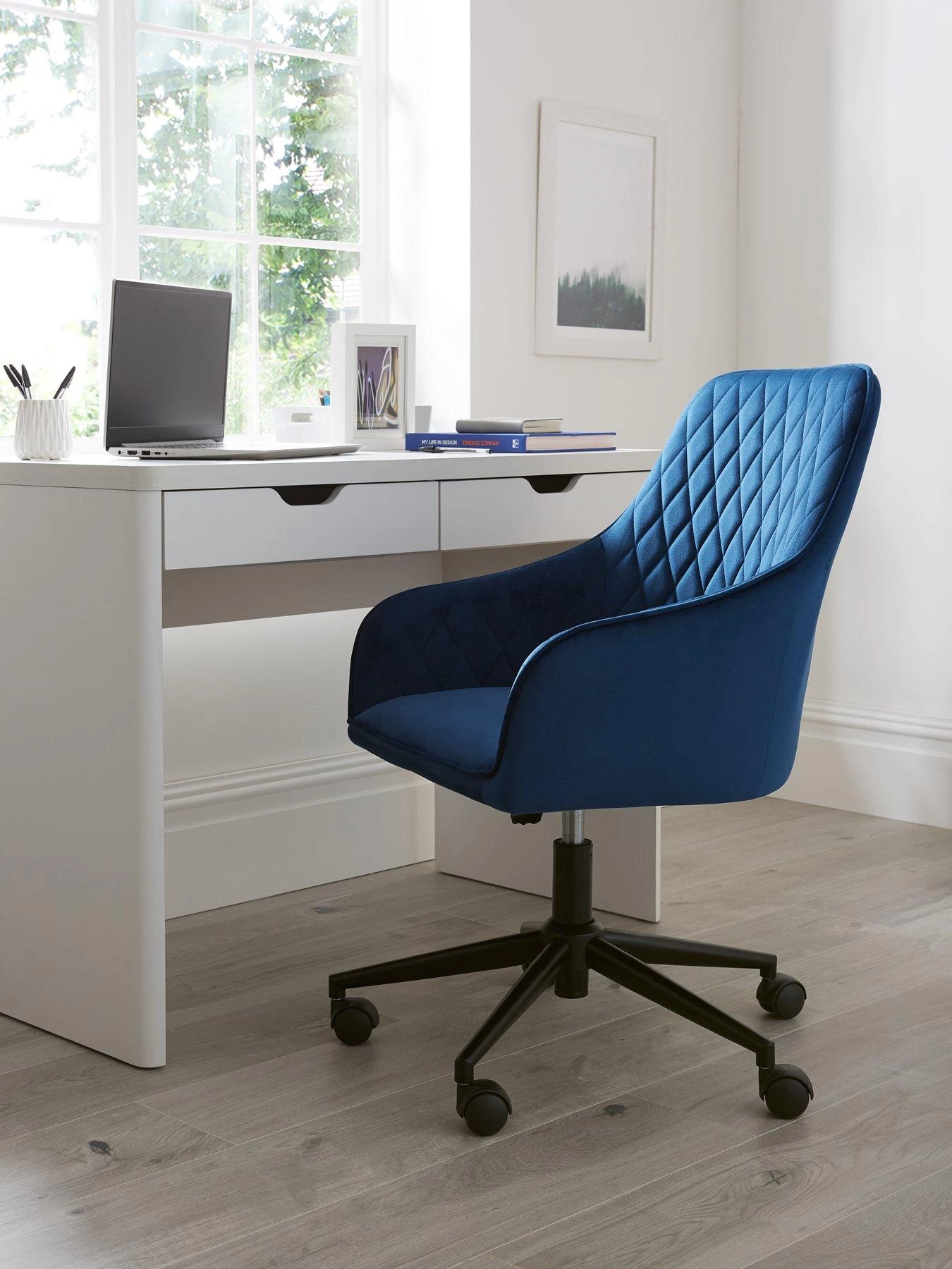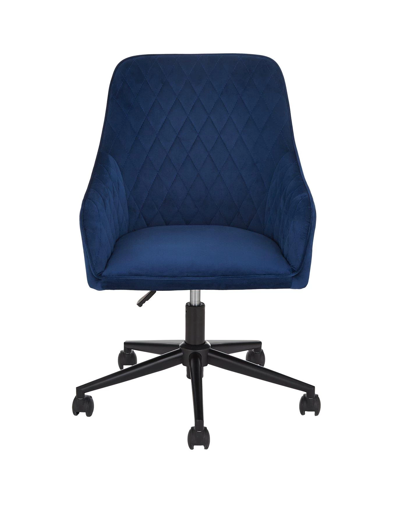Enjoy a little luxury on those days when you’re working from home with this elegant office chair. Wrapped in a textural navy fabric, it features cool curved arms and a diamond stitched pattern to the back. It sits on a black pedestal with castors for easy movement, and the seat is height adjustable between 43 and 53 cm.