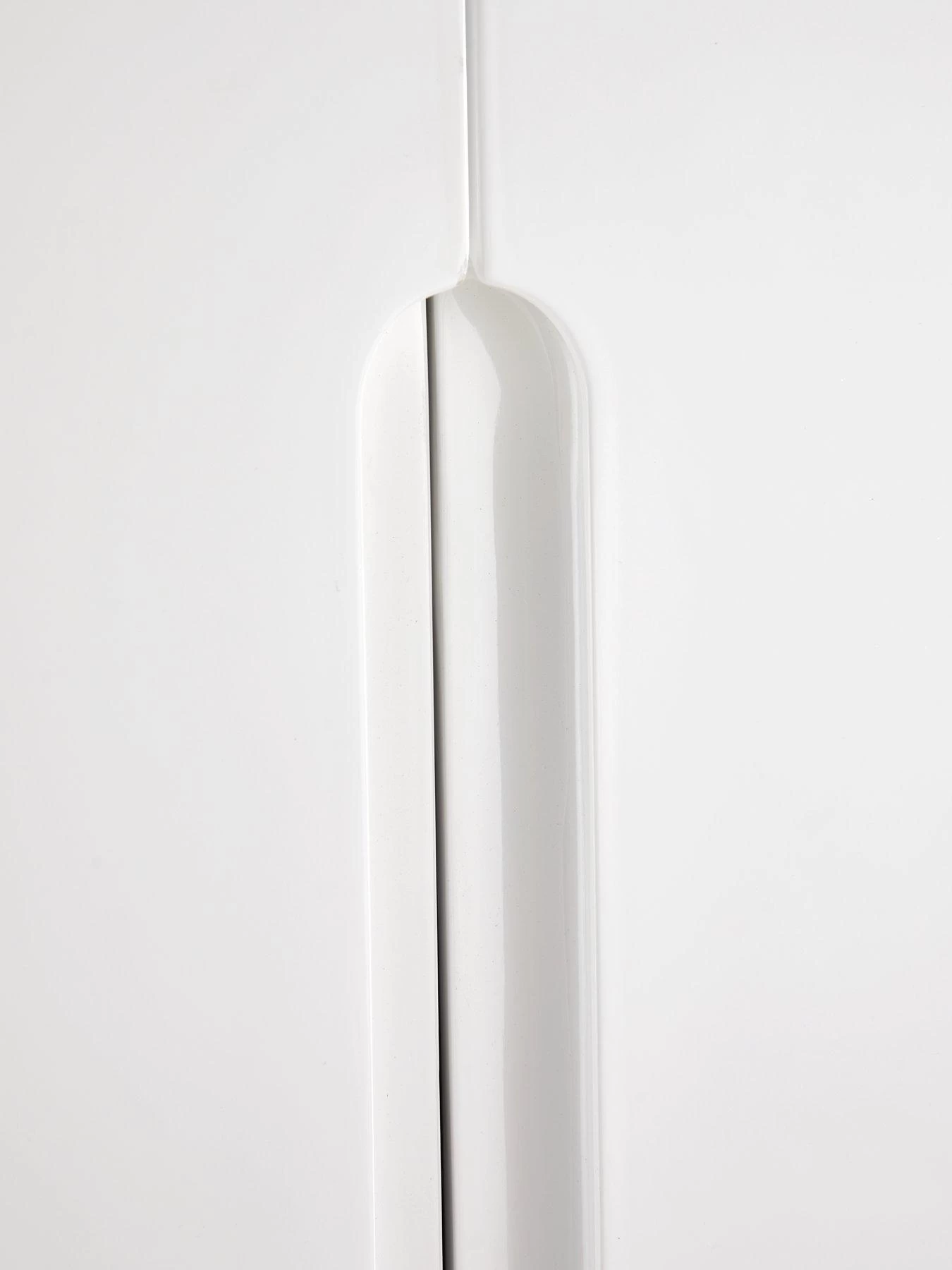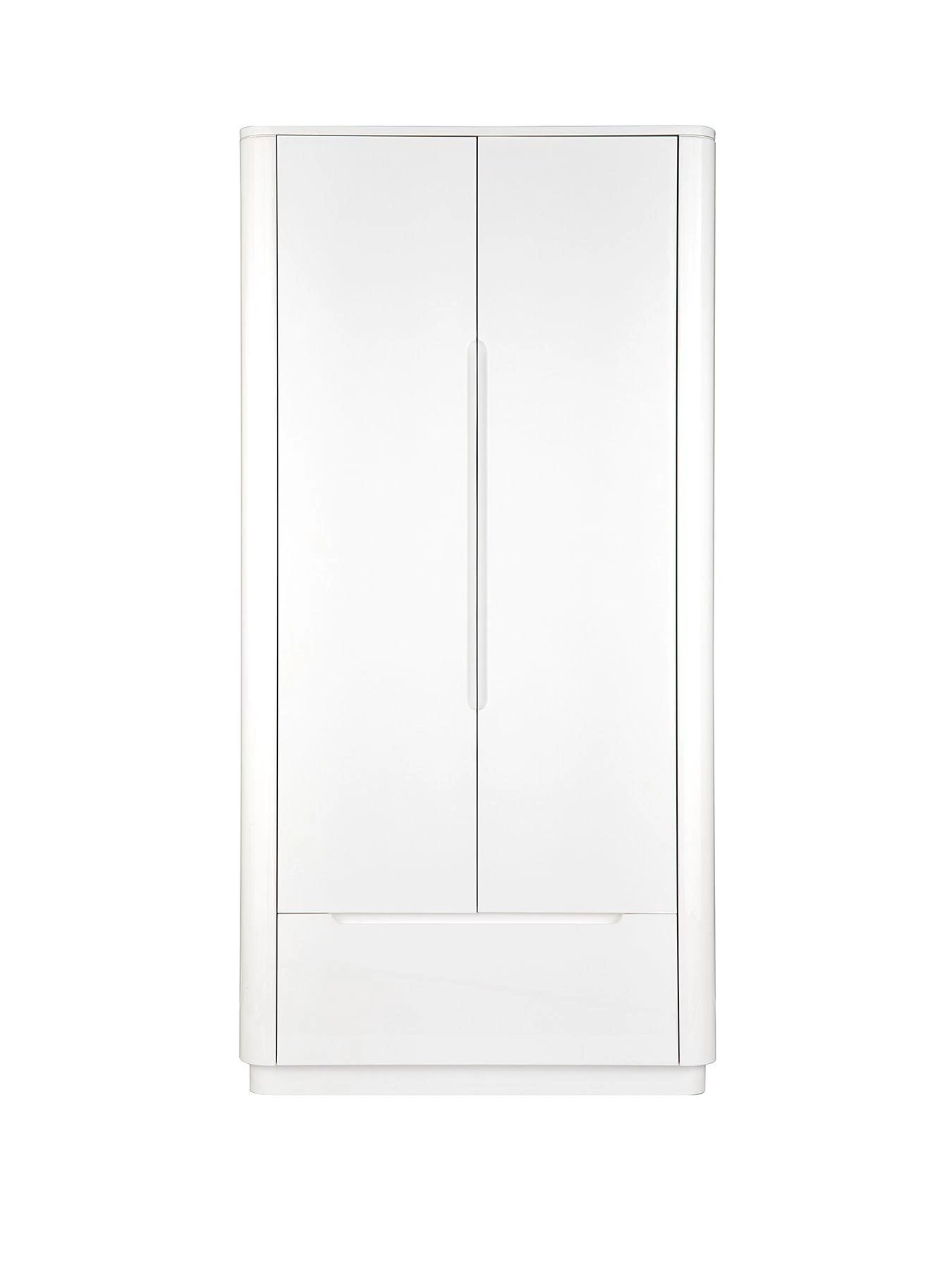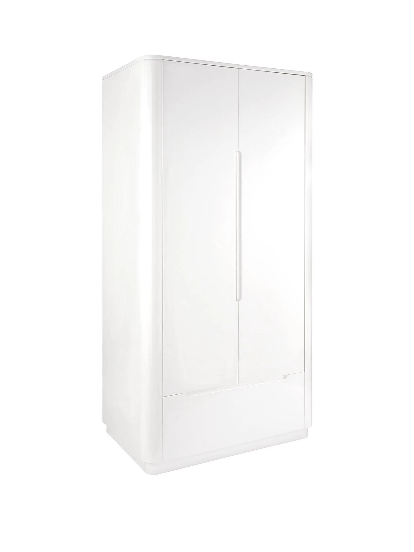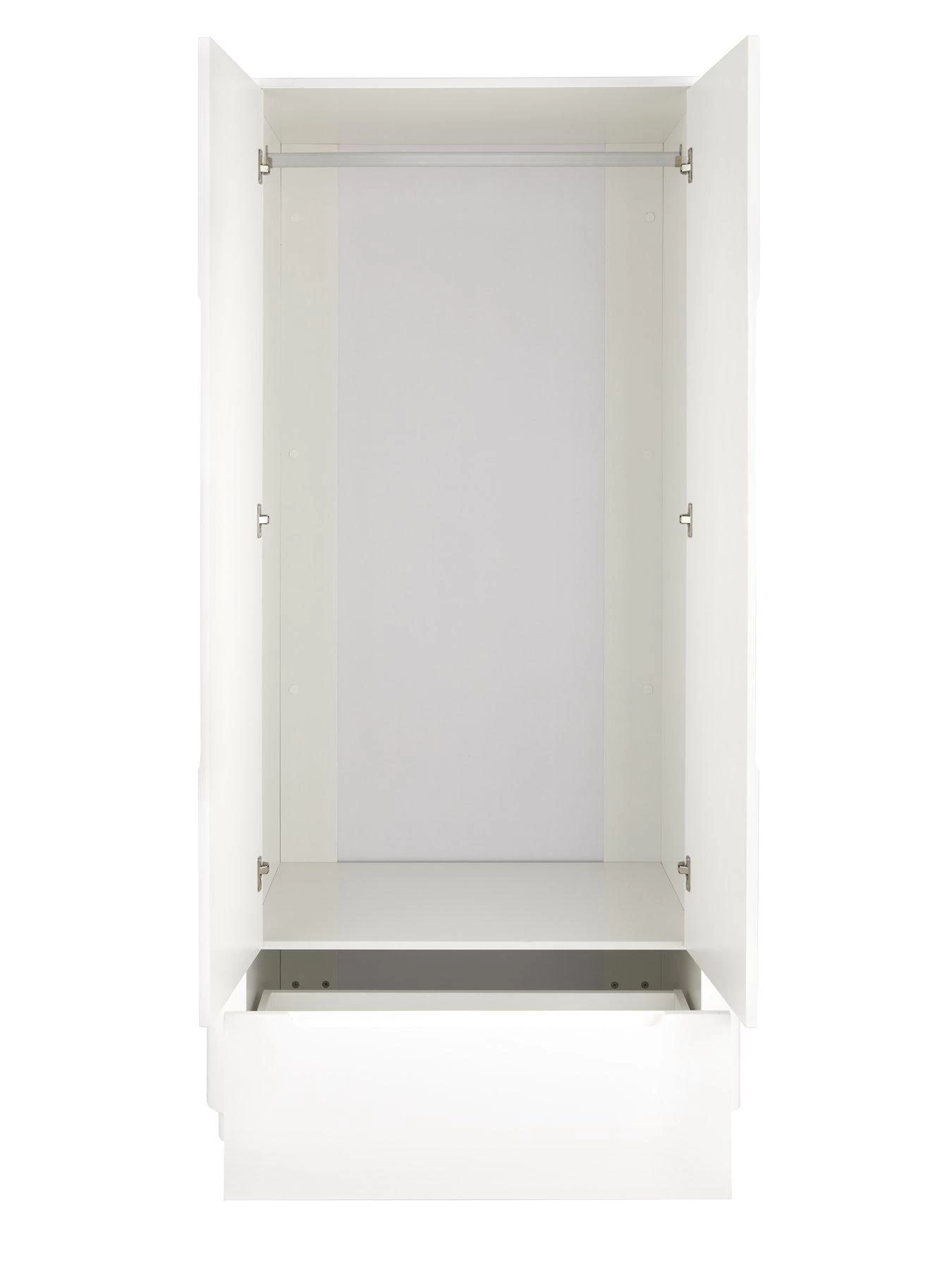 The painted white gloss catches the light, adding a stunning shine across your room, and the smoothness of this finish is echoed by rounded corners. Two doors feature fashionable cut-out handles, and the hanging rail is complemented by a single drawer that opens smoothly even when full thanks to the easy-glide metal runners.