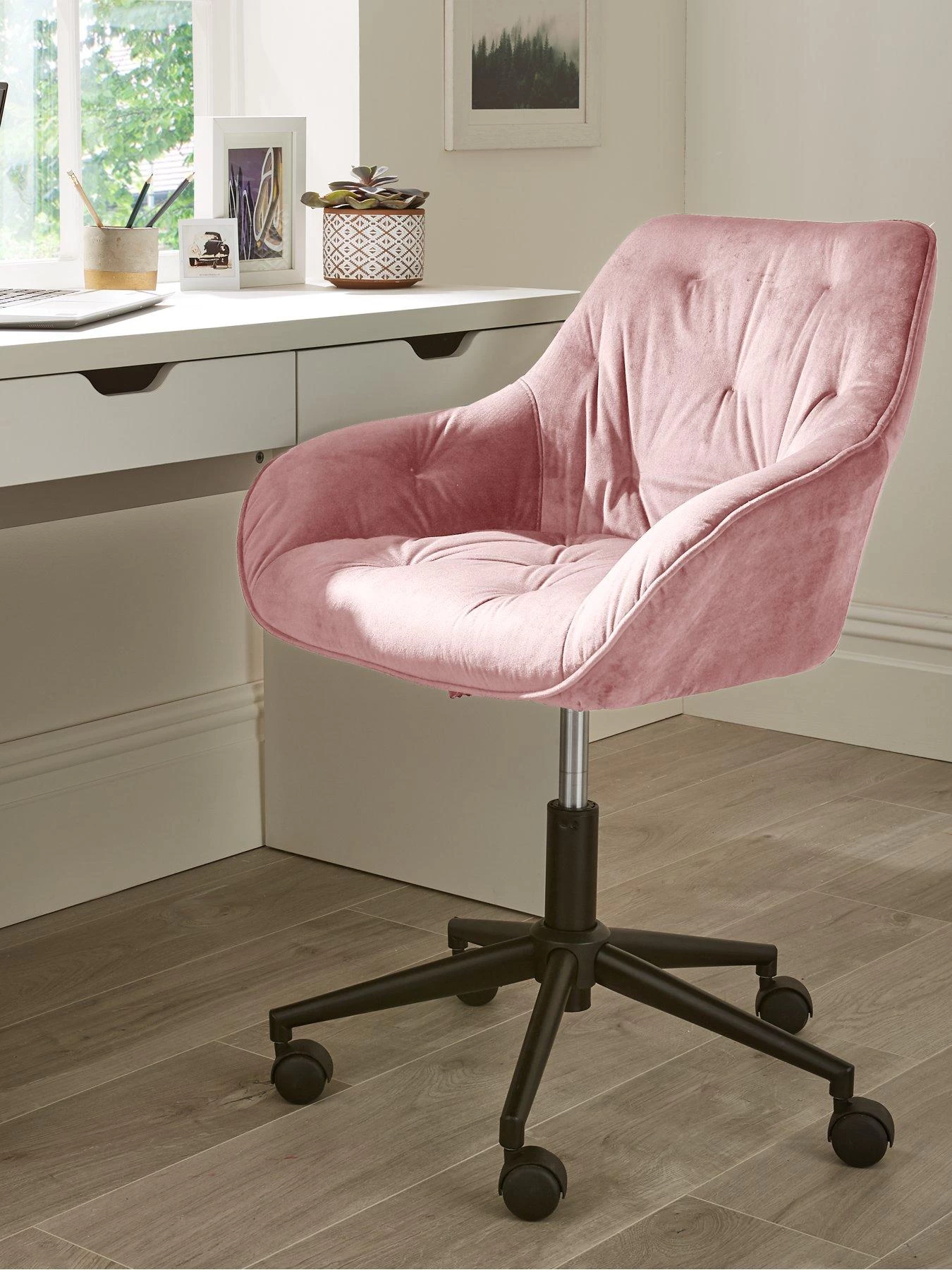 This stylish Harley office chair is upholstered in a rich pink fabric that’s wonderfully textured to provide comfort when working from home. Detailed with decorative pinching, its padded seat and back offer extra relaxation, and it’s height adjustable to help you find the perfect seating position. Finished with a black base and castors for easy movement around your work or study space.