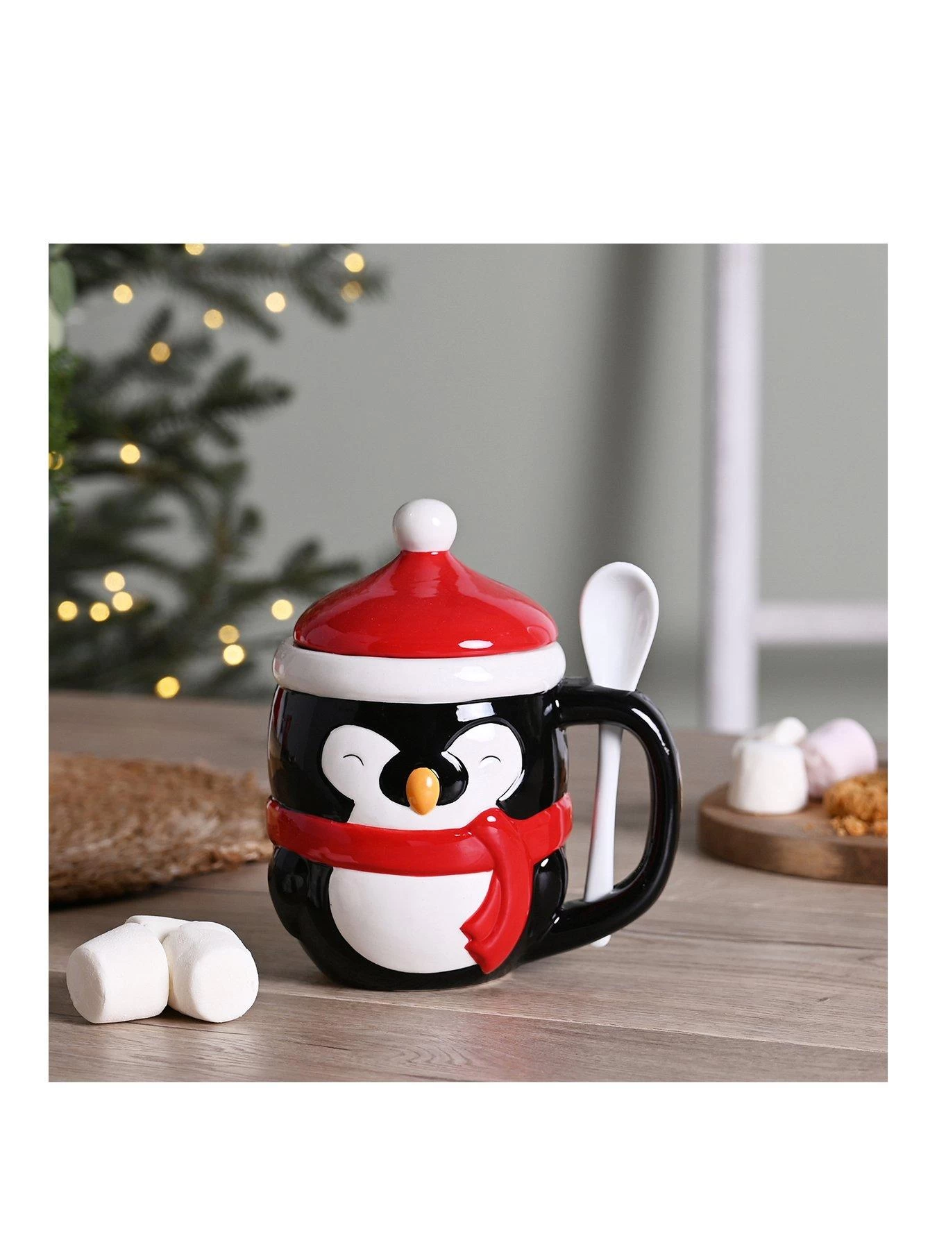The ceramic mug showcases a distinctive penguin design, bold colouring, gloss finish and spoon held within the handle. The penguin’s hat lid ensures that drinks stay warm for maximum enjoyment of hot chocolate or mulled wine.
