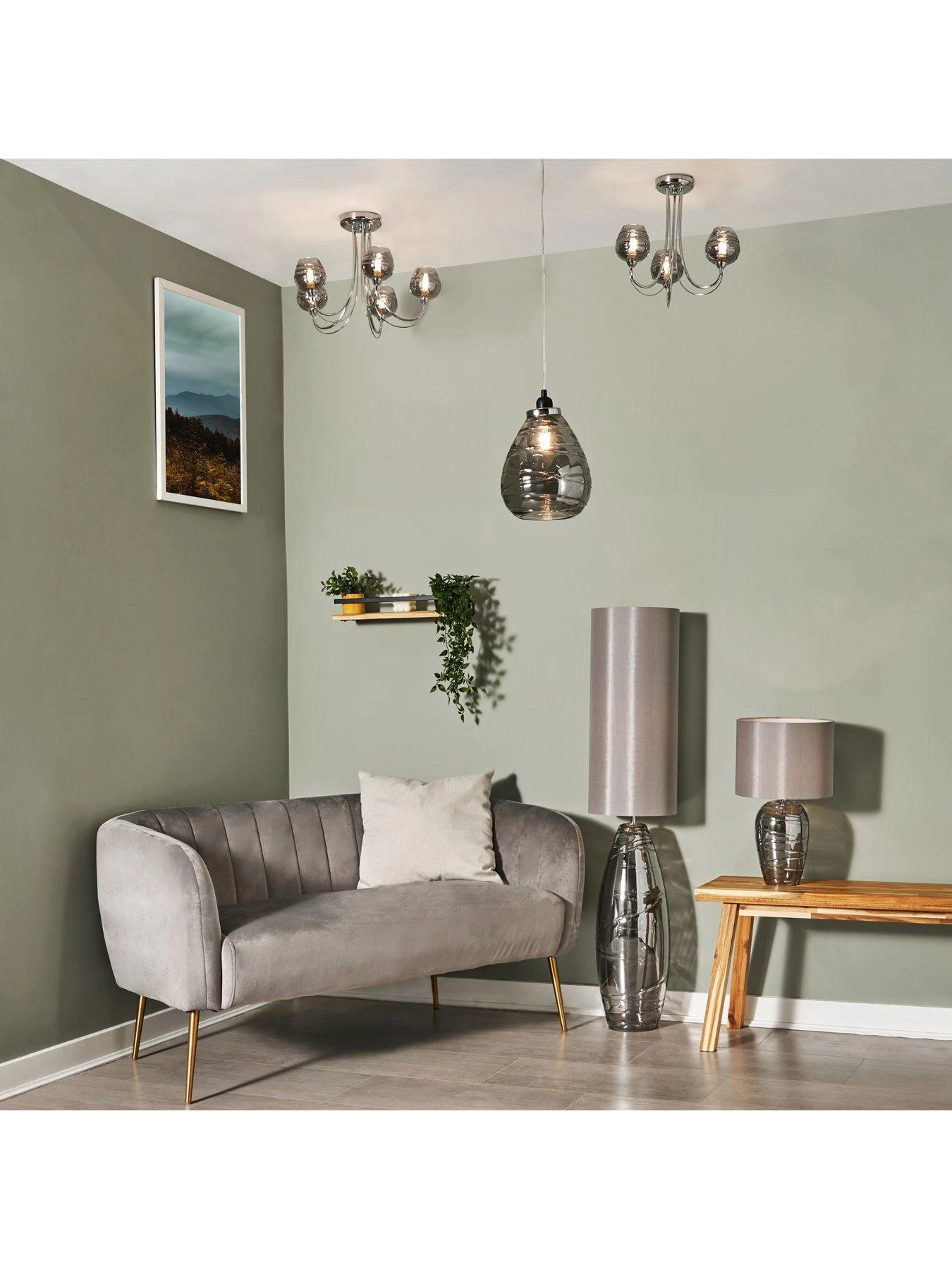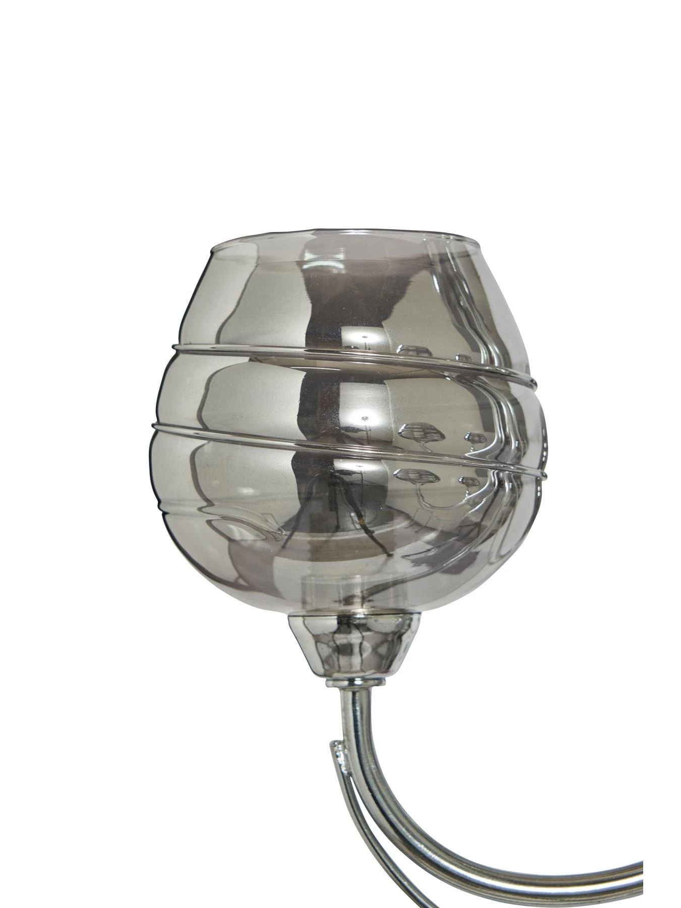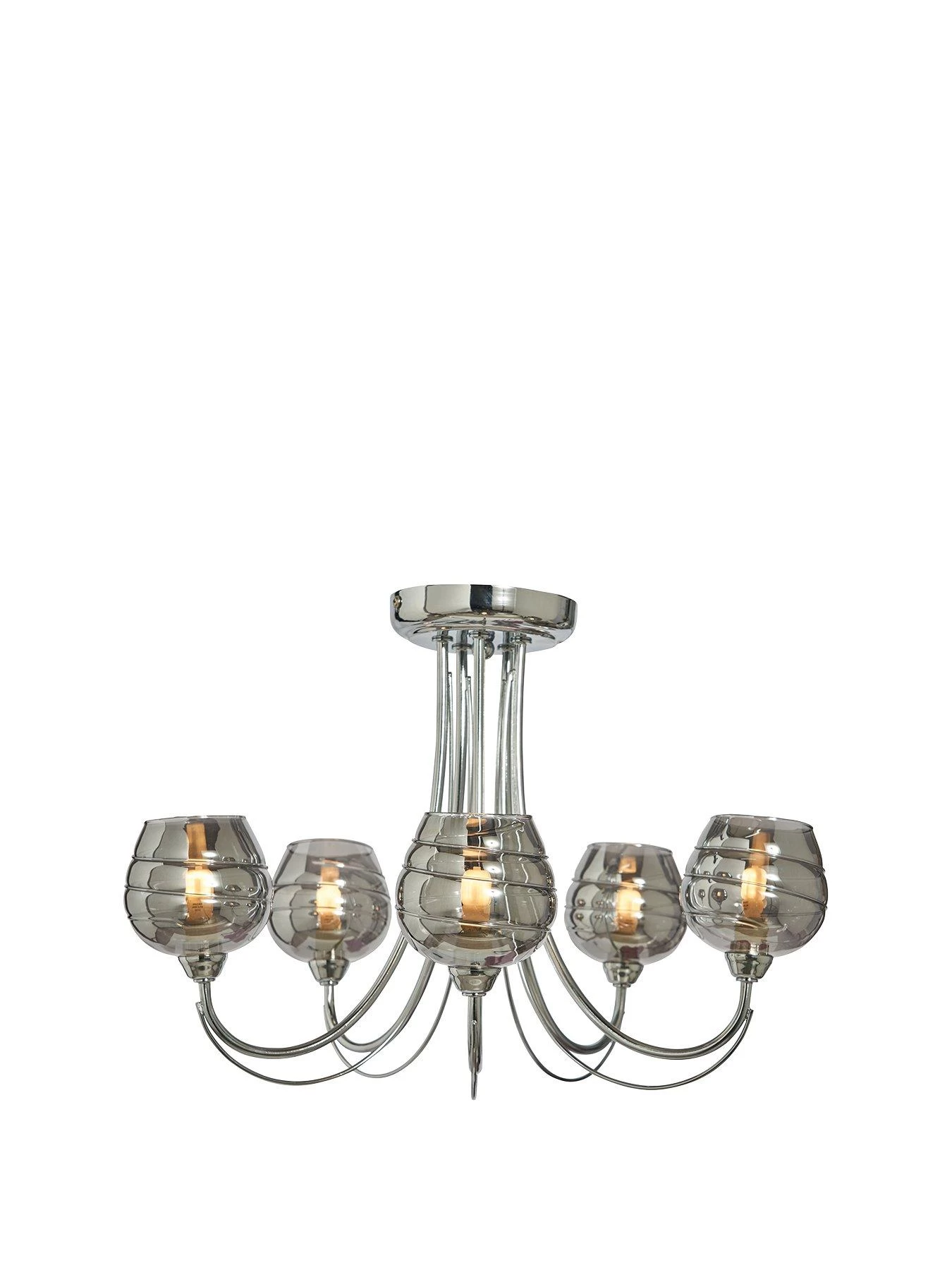 Sitting flush against your ceiling, it sees a total of five separate lights suspended from its chrome base plate, each one sitting on a beautifully curved coordinating arm. All five shades demand the attention in translucent smoke drizzle glass and are finished with swirling lines for a touch of texture.