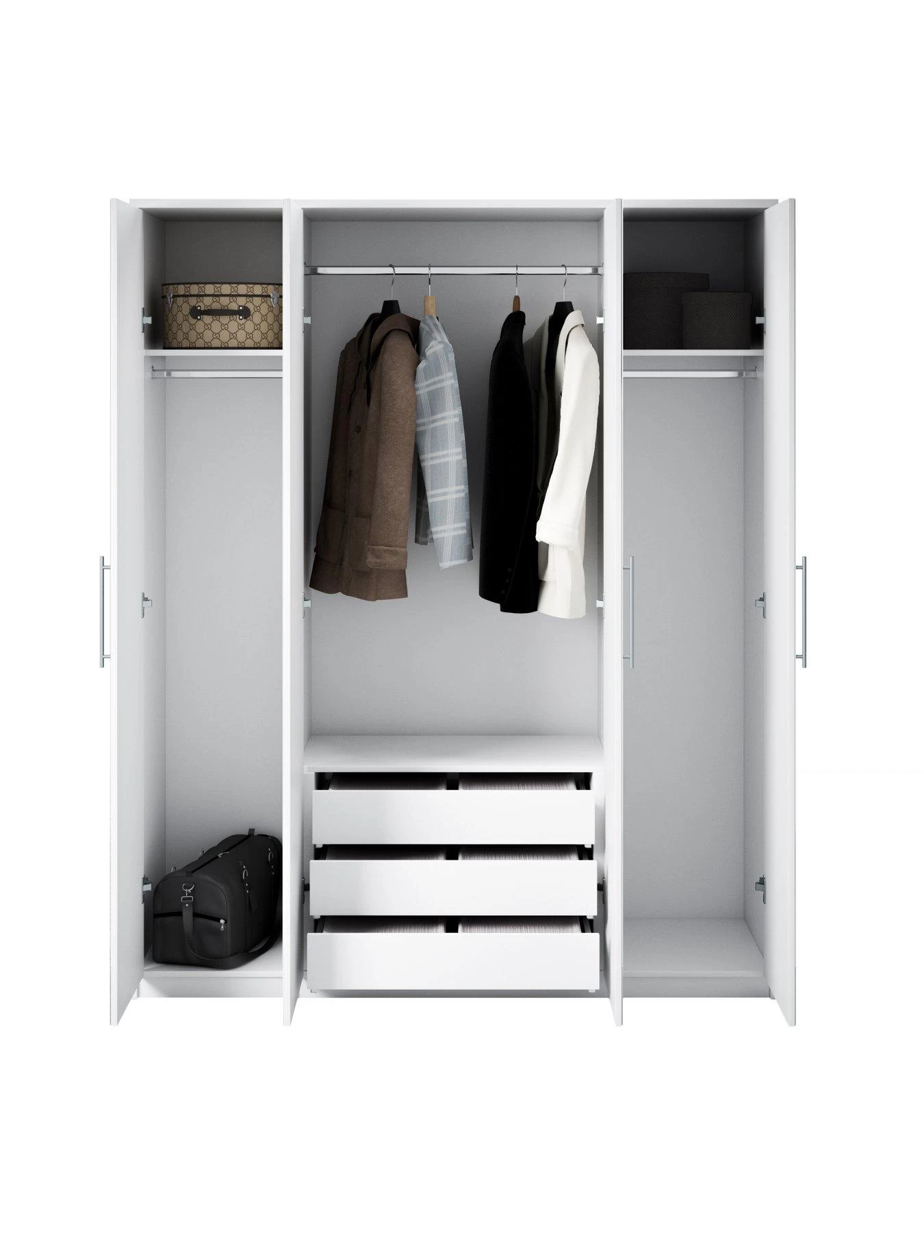 2 narrow outer sections each contain their own hanging rail and high shelf, while a wide middle section features a third hanging rail and 3 drawers for neat organisation of all your folded fashion.