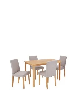 Measuring 120 cm in length, the table top provides more than enough room for the 4 chairs. These are padded for soft comfort during the full three courses, then wrapped in a wonderfully textured grey fabric. They’re finished with wooden legs that match the table, creating a uniformed look right across the set.