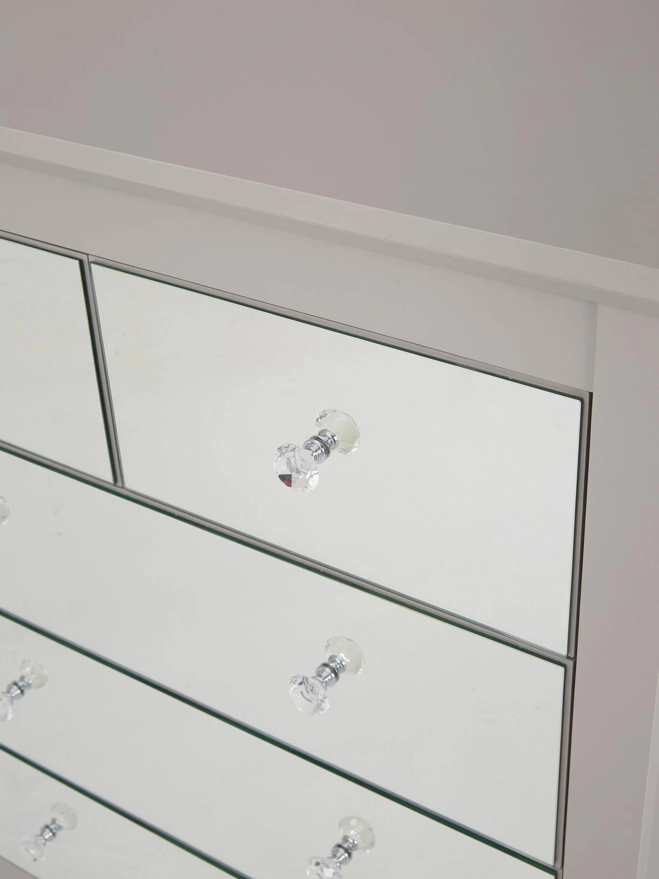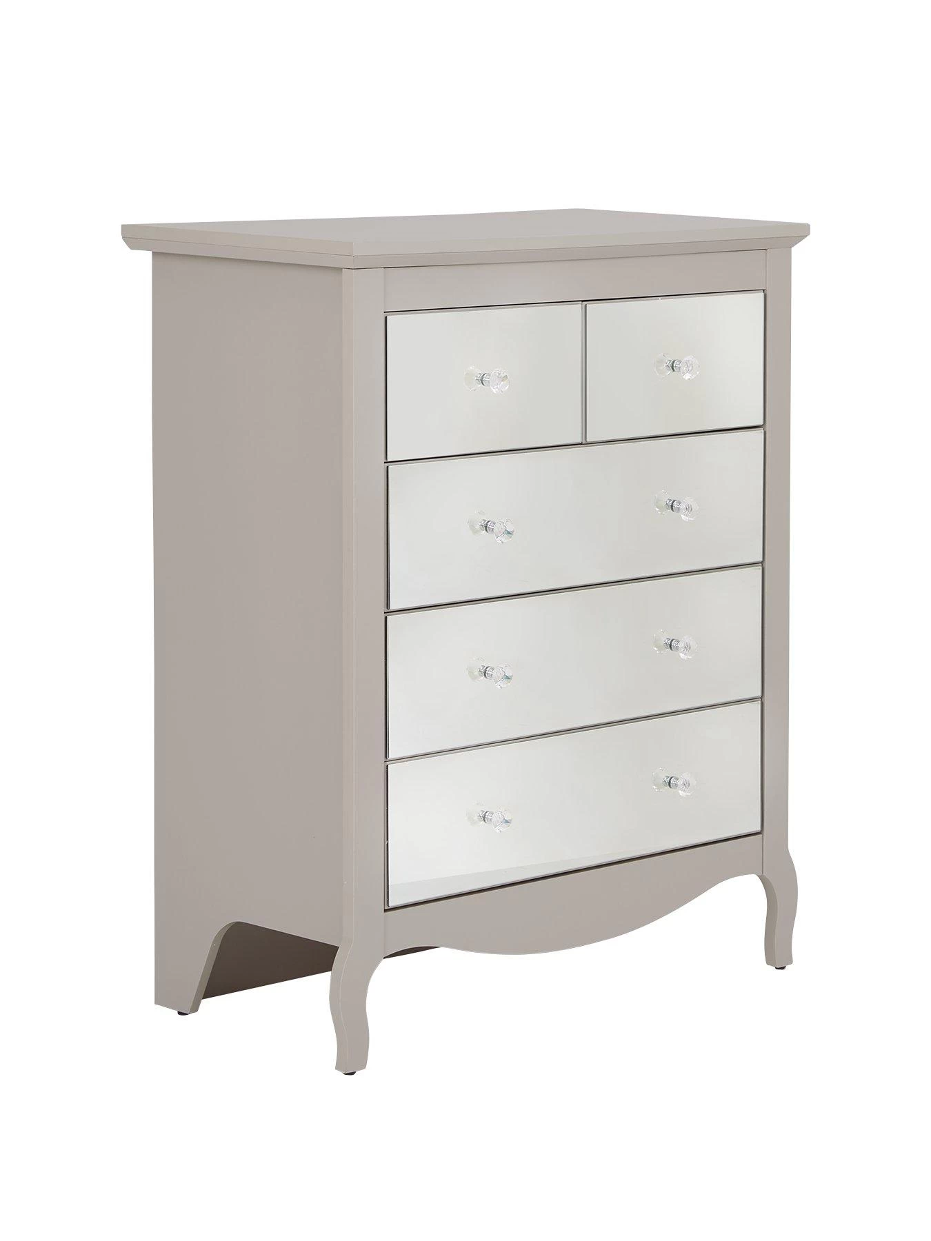 This chest of drawers from the stylish Sandy range shines with an elegant design and modern look. The modern grey frame features shaped legs and an overhanging top, while 5 drawer fronts are mirrored to enhance the light and depth in your bedroom.