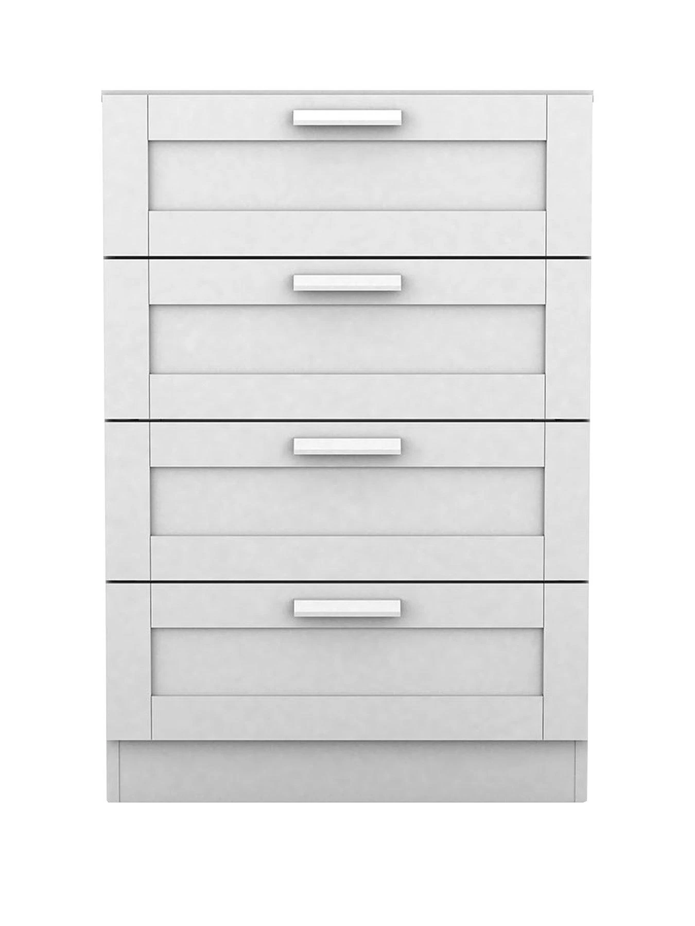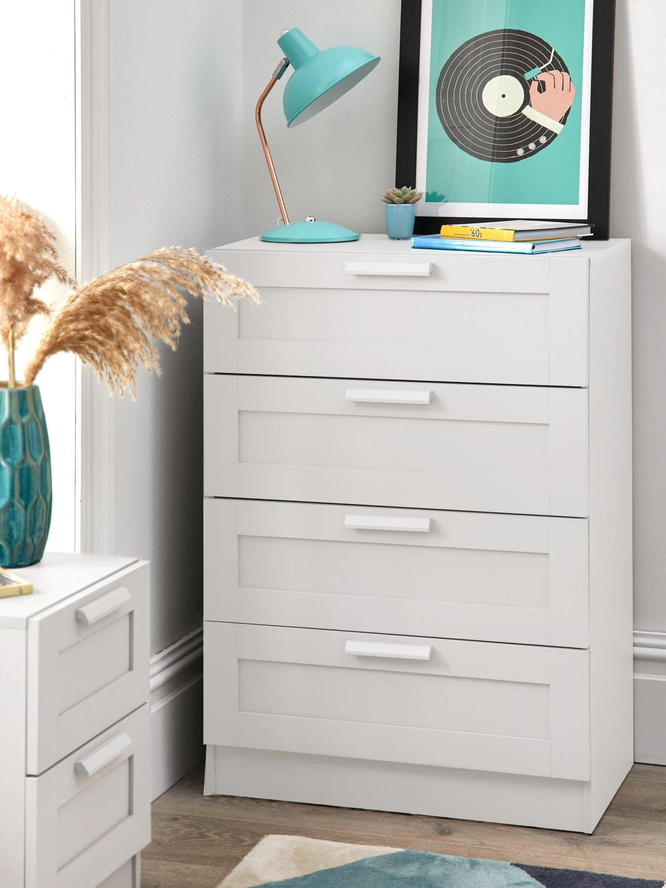 ThisĀ chest of drawersĀ has been finished in a fresh white shade which bathes their bedroom in brightness. 4 drawers are fashionably framed and accented with angular handles for a modern appearance, while easy-glide runners ensure they’ll open smoothly even when full of clothes.