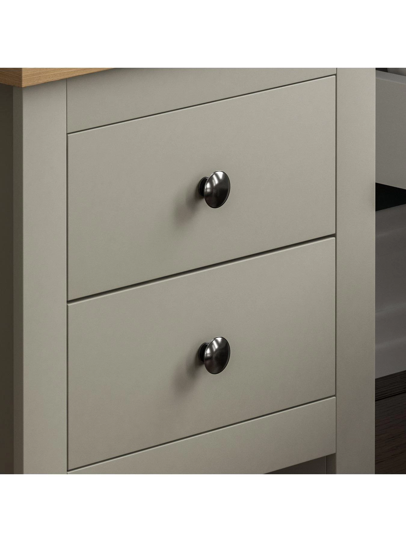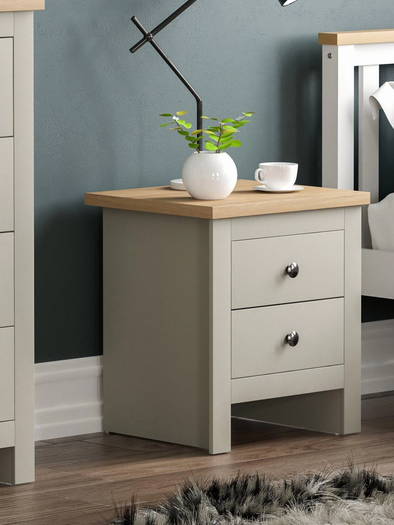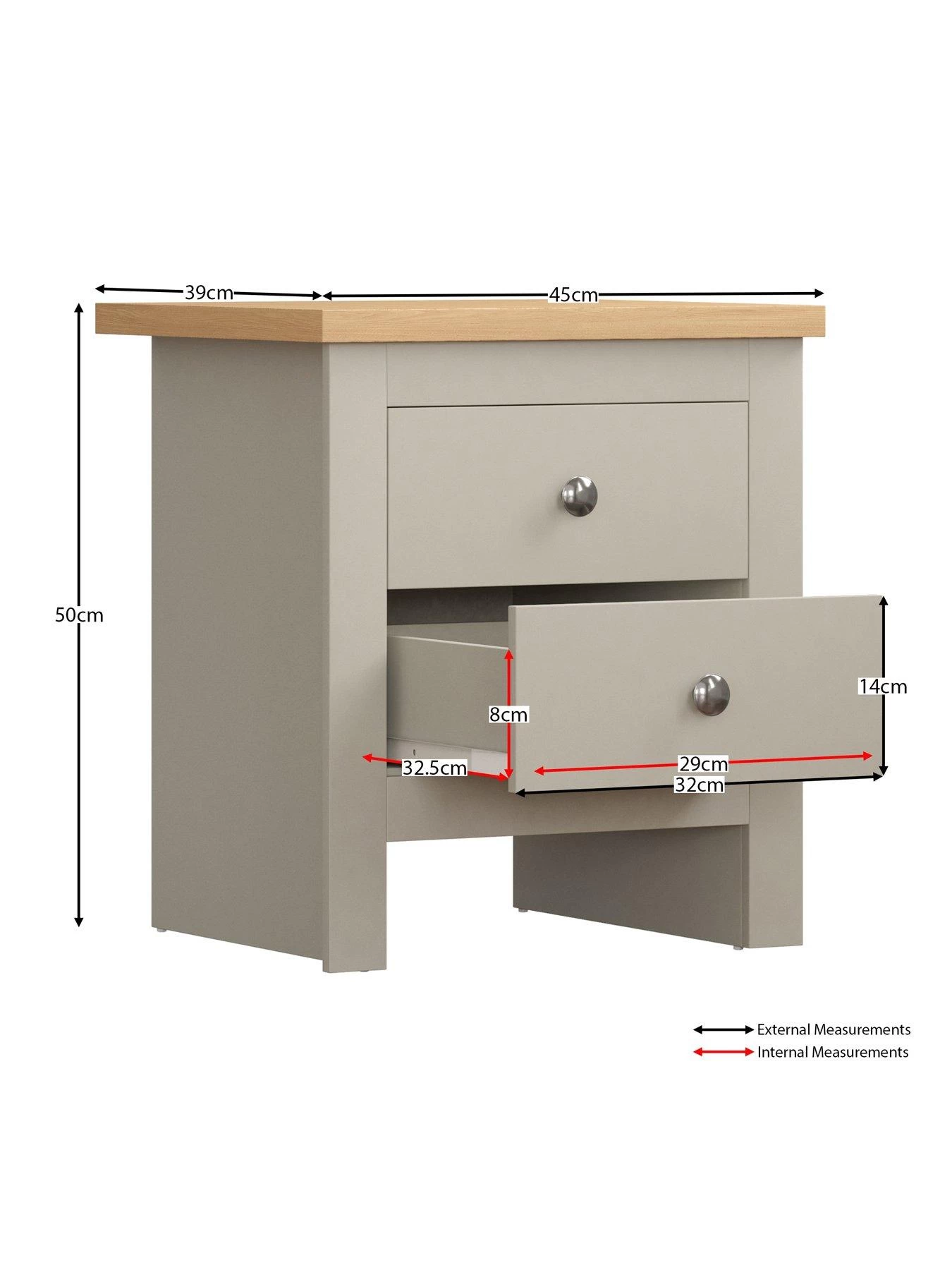 Styled with chunky sides for a substantial look, its 2 drawers allow you to neatly organise your bedside essentials. It’s finished with metal knob handles and easy-glide metal runners that result in a smooth open/close action.