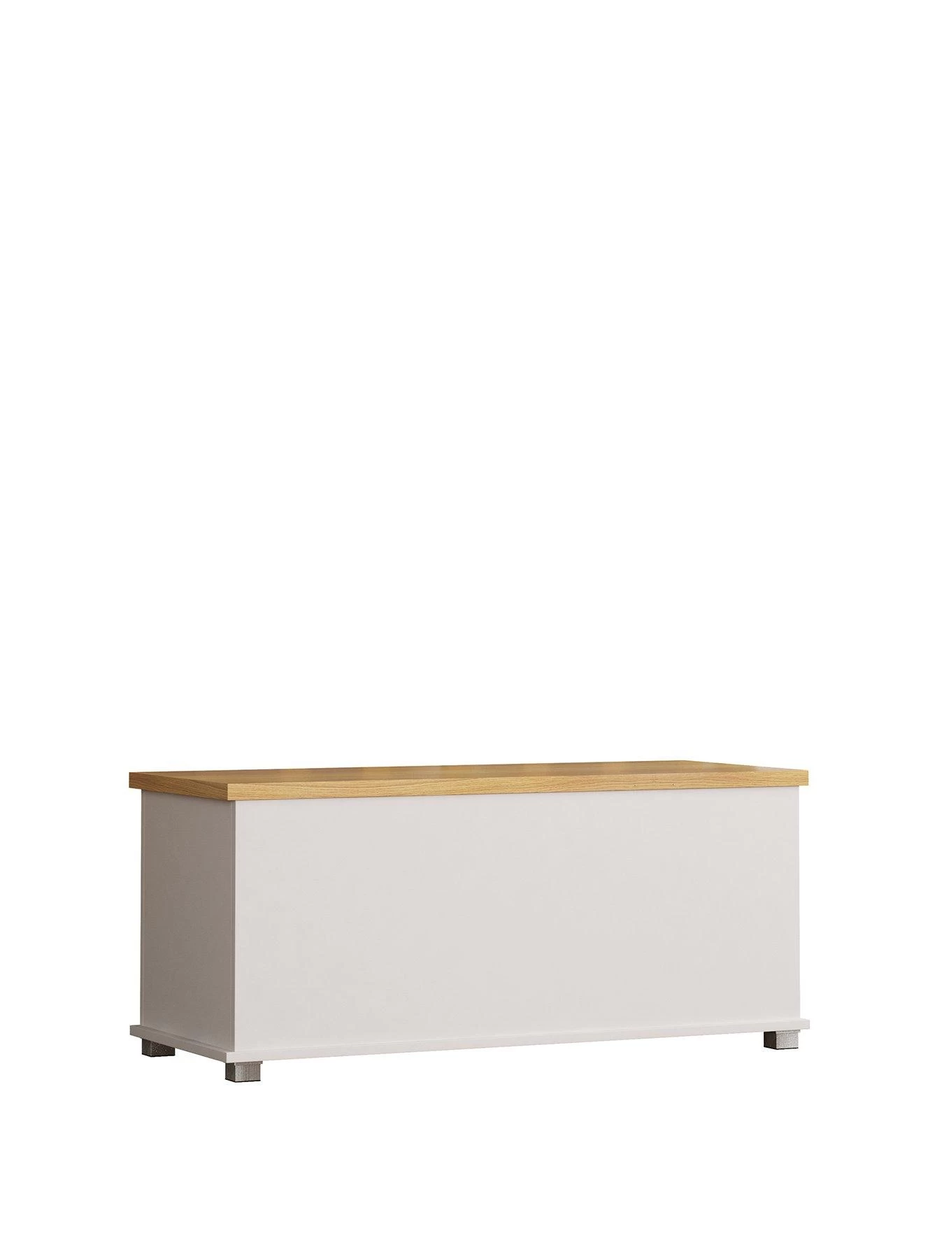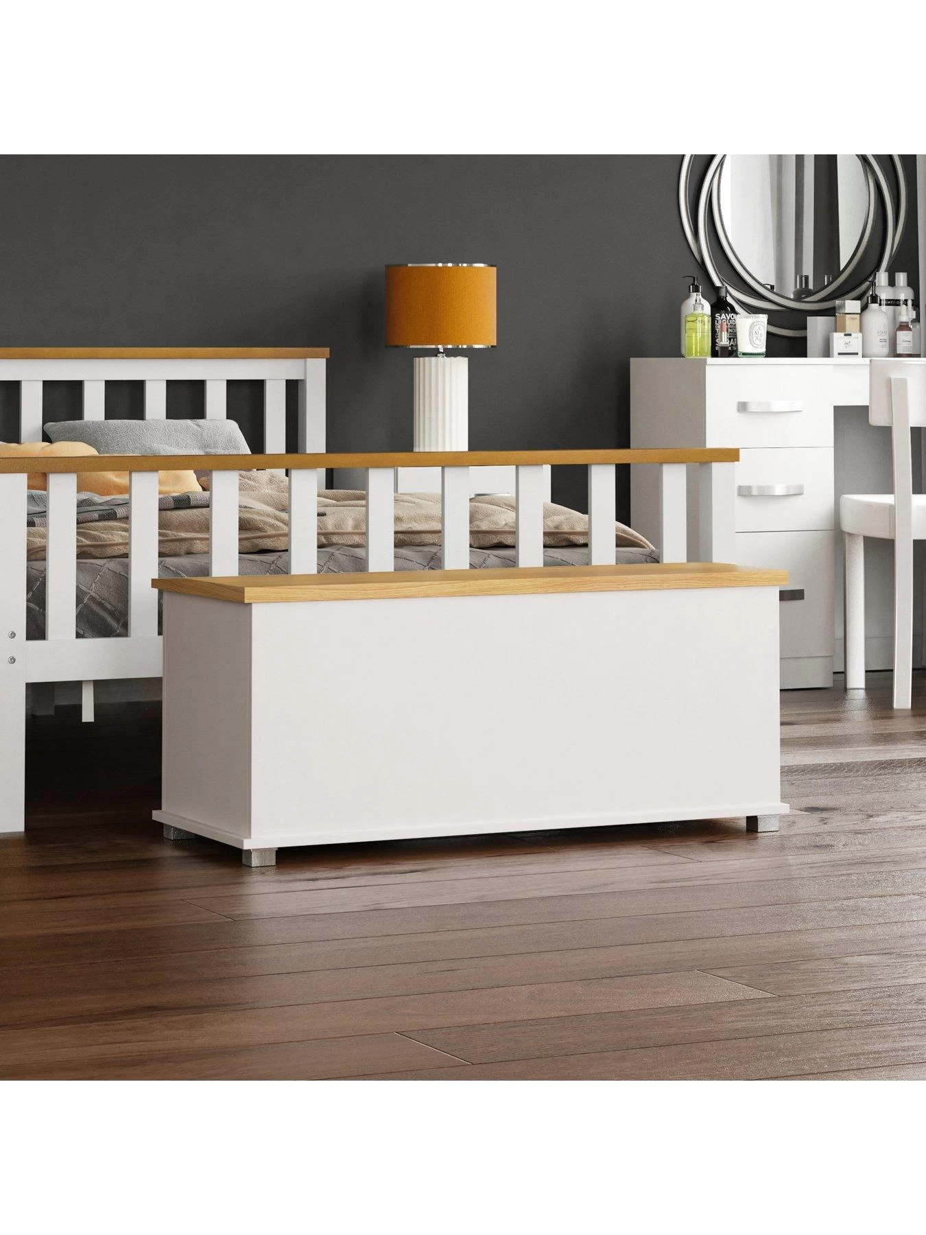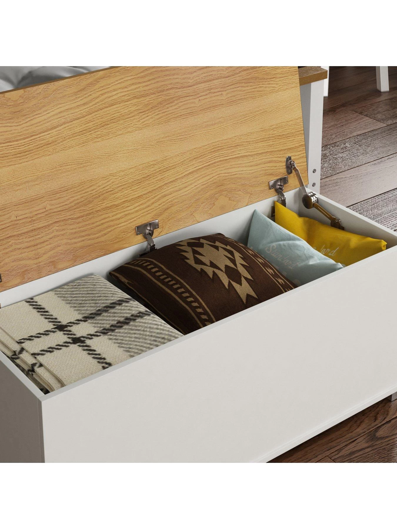 Finished in an eye-catching two tone that features a white base and contrastingย oak-effect lid. Suitable for use as a bench in your bedroom, you can lift up the lid to reveal a generous storage area – ideal for freeing up space in your wardrobes and cupboards by keeping spare bedding and pillows organised.